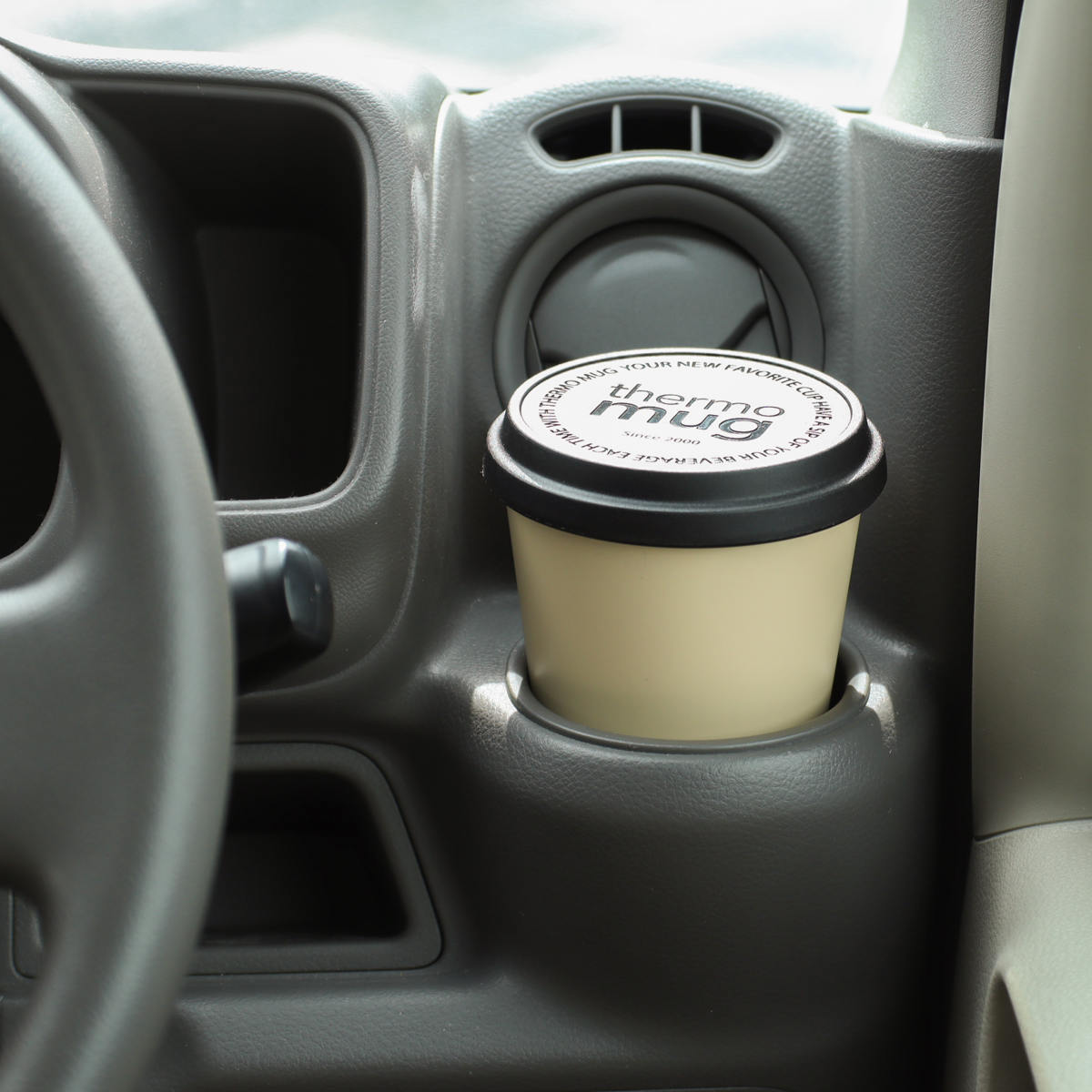 車のドリンクホルダーにもすっきり収まります。スリムな形状で出し入れがしやすく、運転中でも手に取りやすいです。