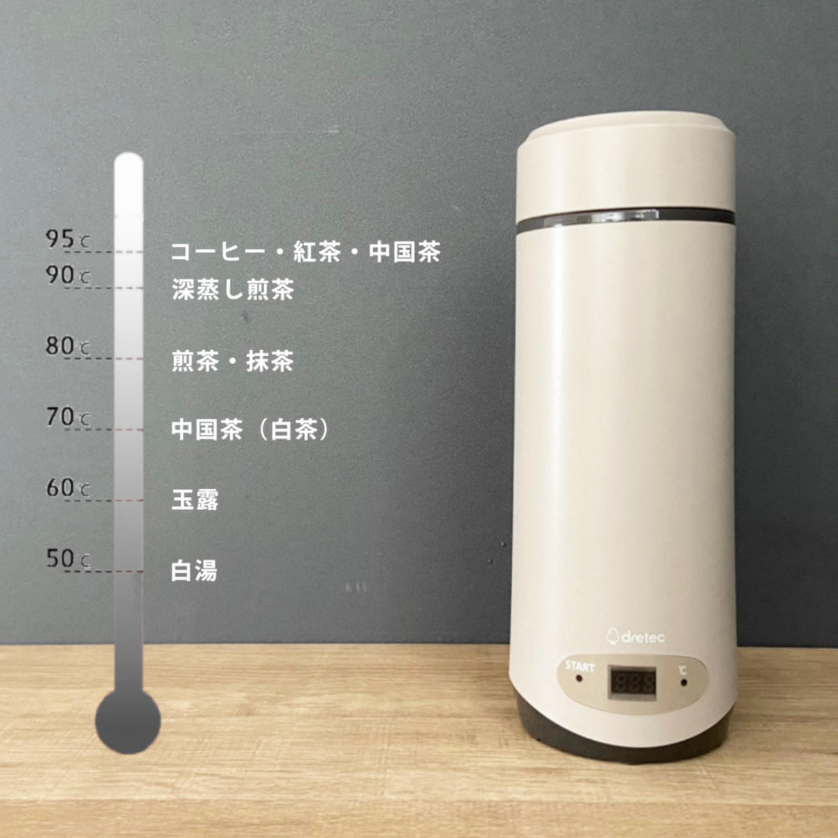 ちょっとお湯が欲しい時にちょうどいい、200mlから沸かせる温調ボトルです。温度調節モードでは50、60、70、80、90度で、湯沸かしモードでは95度で沸かすことが可能です。お茶や紅茶、ミルクなど、それぞれの飲み物に最適な温度で沸かせます。