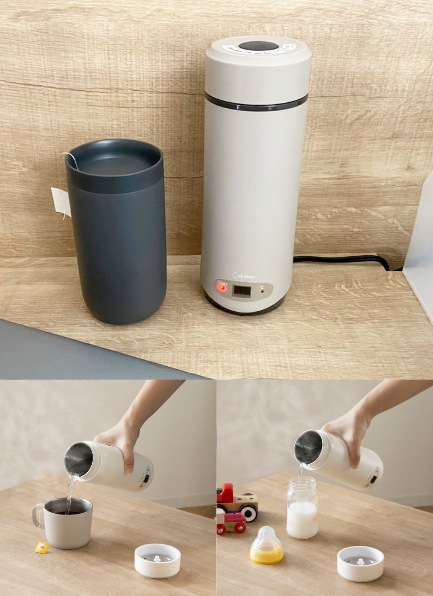コンセントやポータブル電源に繋げばどこでもお湯が沸かせるので、オフィスに給湯スペースがなくてもインスタントラーメンやコーヒーが作れます。出張先や旅行先、外出先での赤ちゃんのミルク作りや入院時など、様々なシーンで大活躍します。