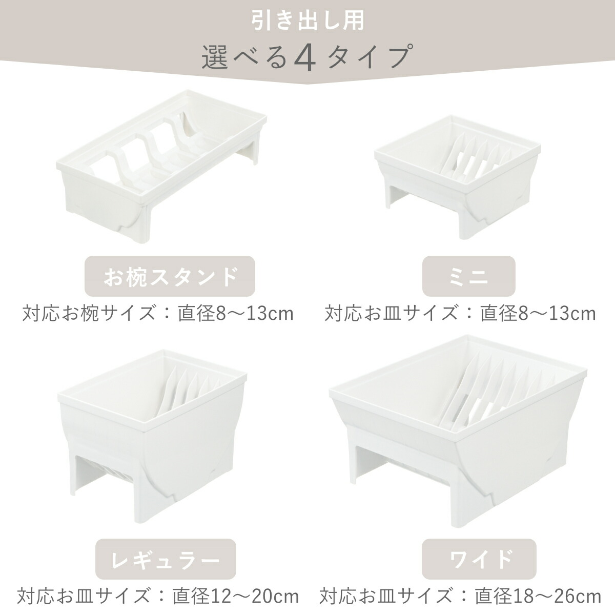 お椀スタンド(8~13cmのお椀やボウル)、ディッシュスタンドのミニ(8~13cm)、レギュラー(12~20cm)、ワイド(18~26cm)の4種類をご用意。使う場所や入れる食器に合わせて自由な組み合わせで深引き出しの整理整頓ができます。