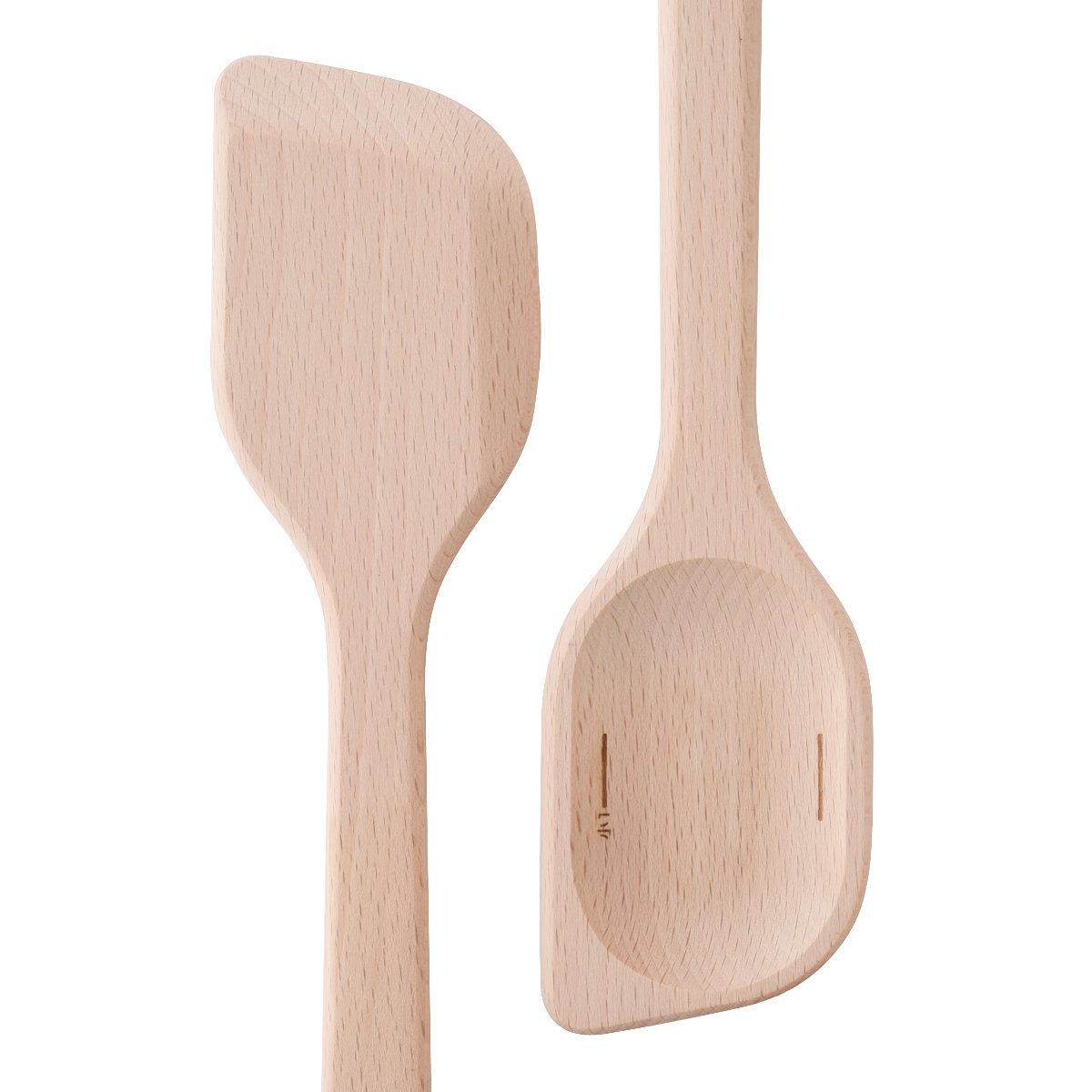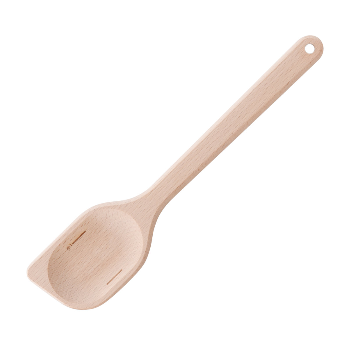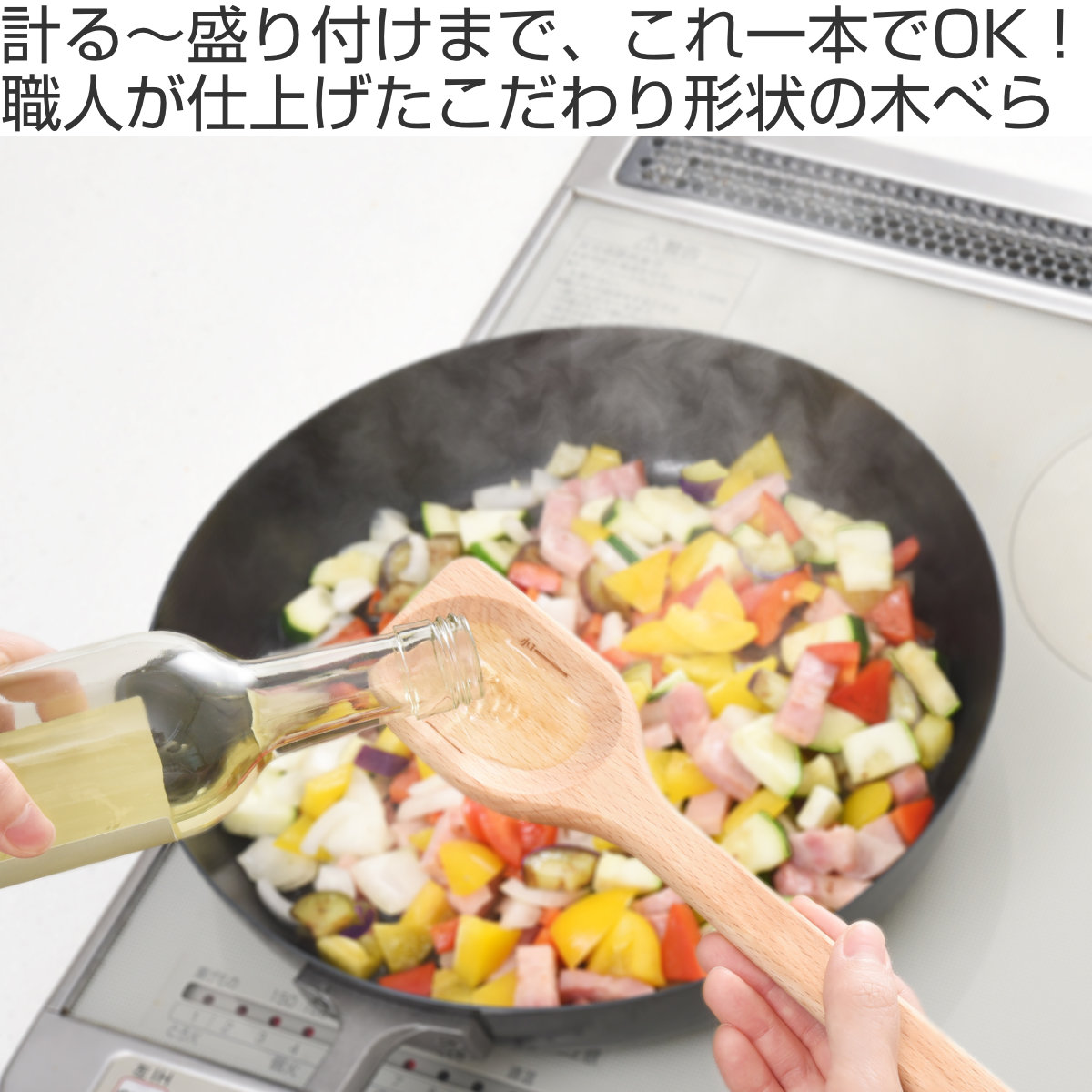 目盛つきで材料の計量ができ、炒めるときはもちろん盛り付けまでこなす便利な木べらです。計量スプーンなど他のキッチンツールが不要なので、洗い物が減って調理の時短にもなります。