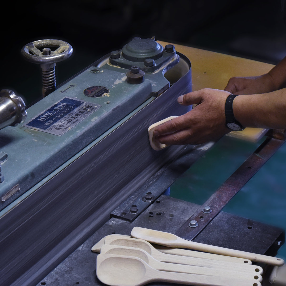 鍋やフライパンの隅までしっかりフィットして食材をかき集めやすいよう、先端の形状と厚みにこだわりました。木べらの先端部分が厚さ3mmになるよう、職人の手によって1本ずつ丁寧に削り上げています。