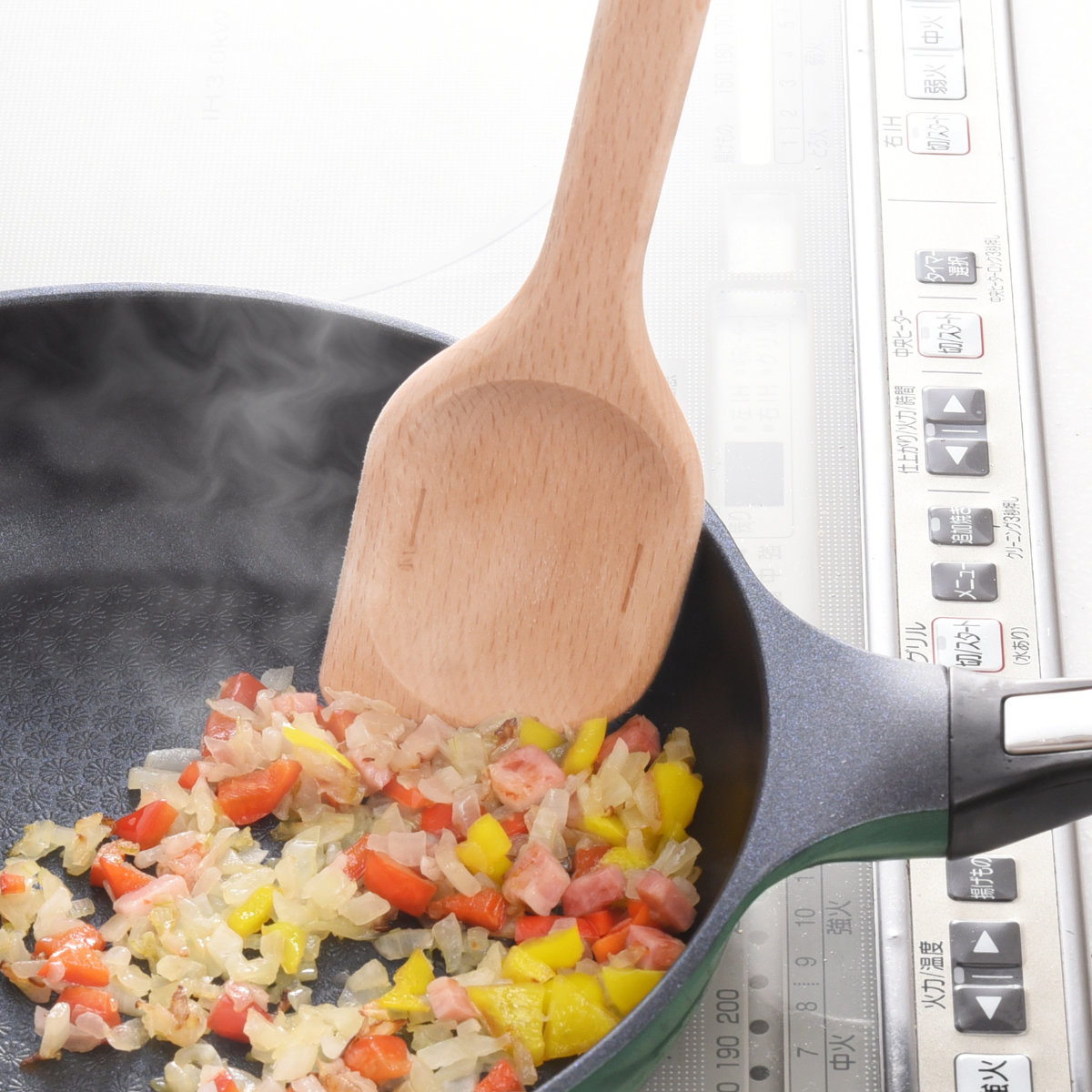 木製なので熱で溶けることもありません。金属ヘラと違ってコーティングを傷つける心配もないので、どの鍋やフライパンにも安心してお使い頂けます。