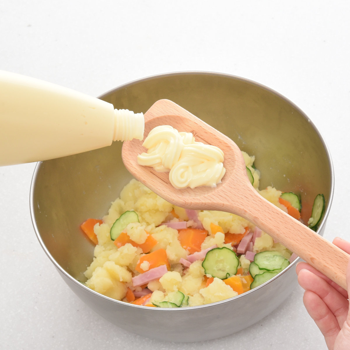 例えば、ポテトサラダを作る場合でも「じゃがいもを潰す」「調味料をはかる」「まぜる」「盛りつける」という工程をこの木さじ1本でこなせます。他のキッチンツールを使う手間や洗い物が減り、スピーディーに調理できます。
