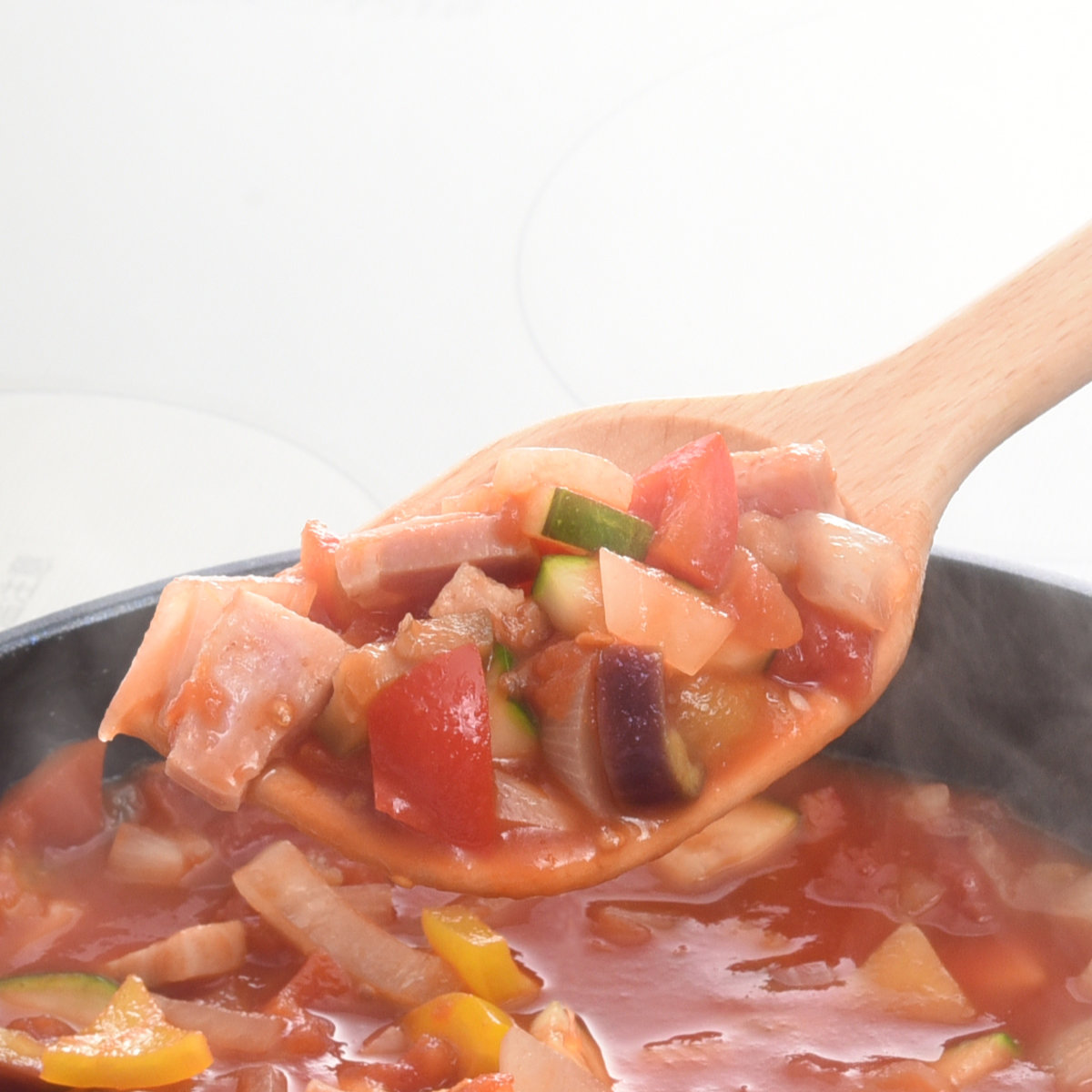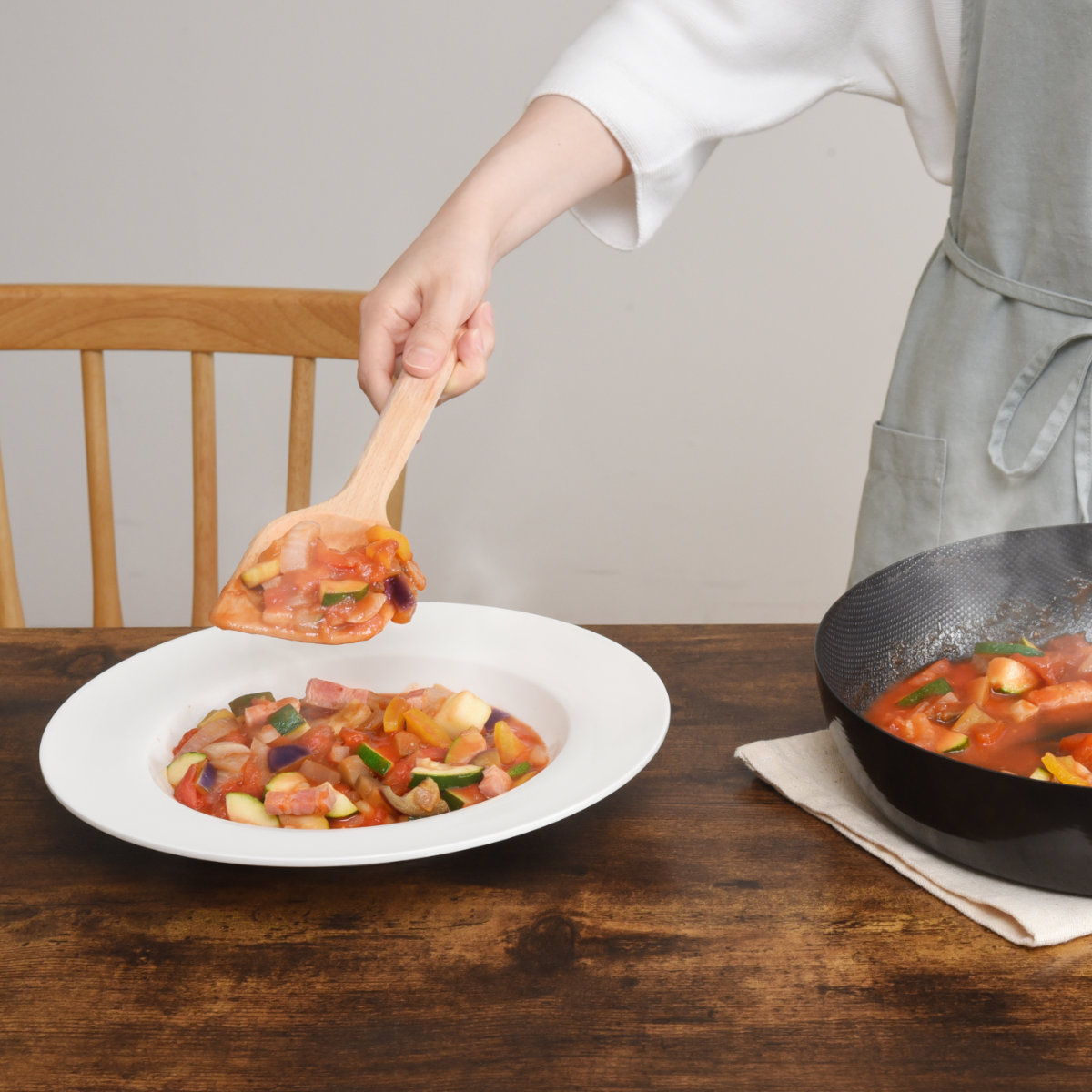 一般的な計量スプーンだと、ソースなど粘度のある調味料はくぼみ部分に残りがち。でも、この木べらは炒めたり混ぜたりの工程にそのまま使えるので、ムダがありません。