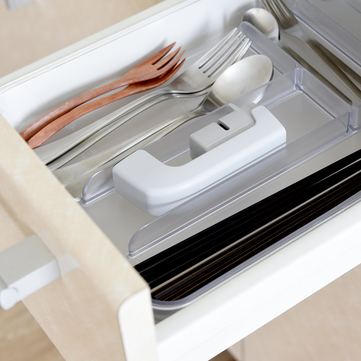 小さくたたむことで、キッチンの浅い引き出しにもしまえます。引っ掛かったり邪魔になったりしにくい形状なので、スッキリと収納できます。