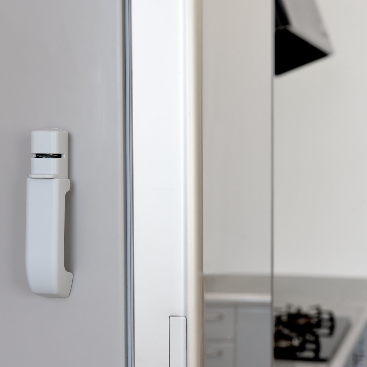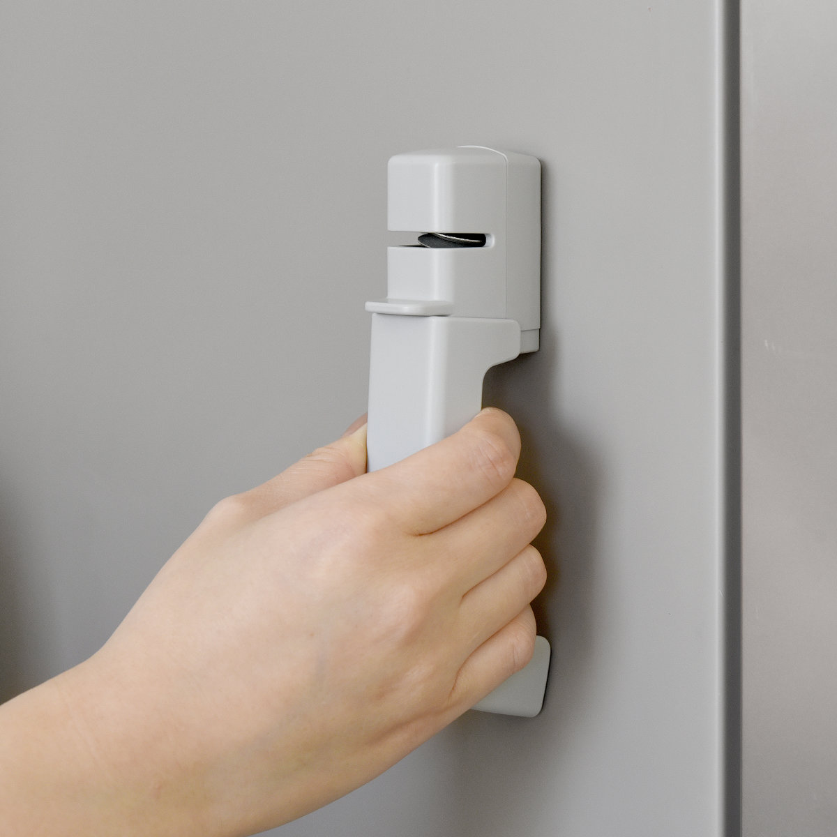 裏面にはマグネットがついているので、冷蔵庫の側面など磁石が使える壁面にぴたっと貼りつけて収納できます。本体は落ち着いたグレーカラーで、目につく場所に置いても生活感が気になりません。