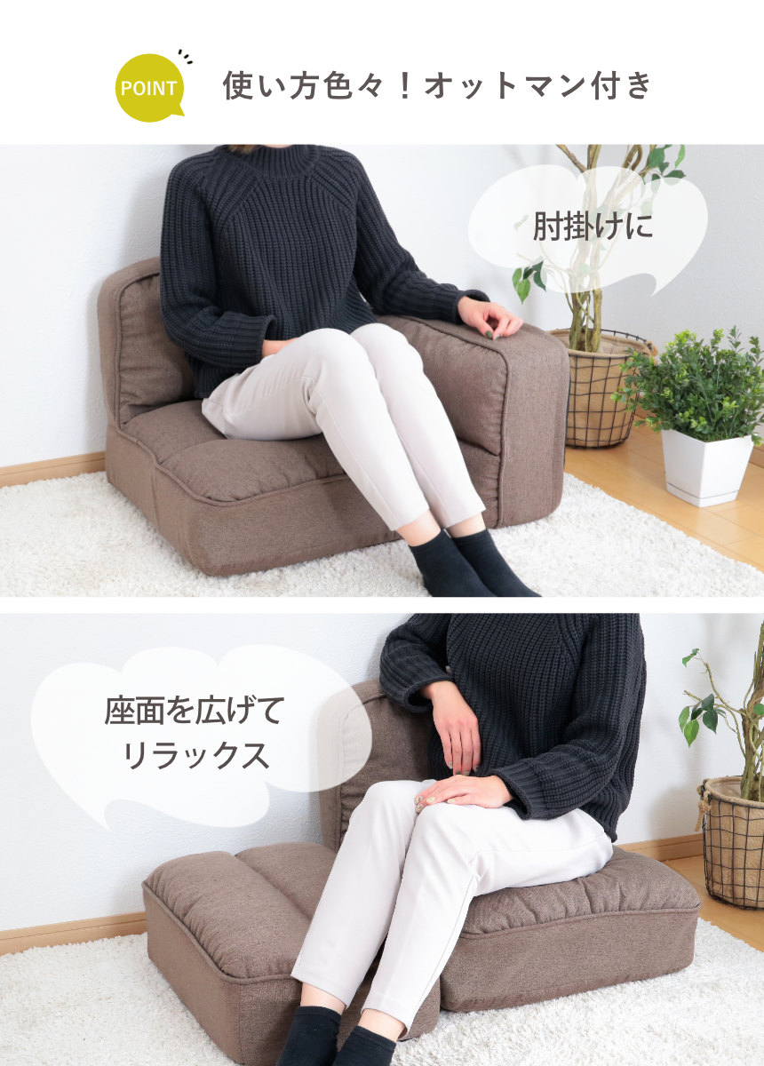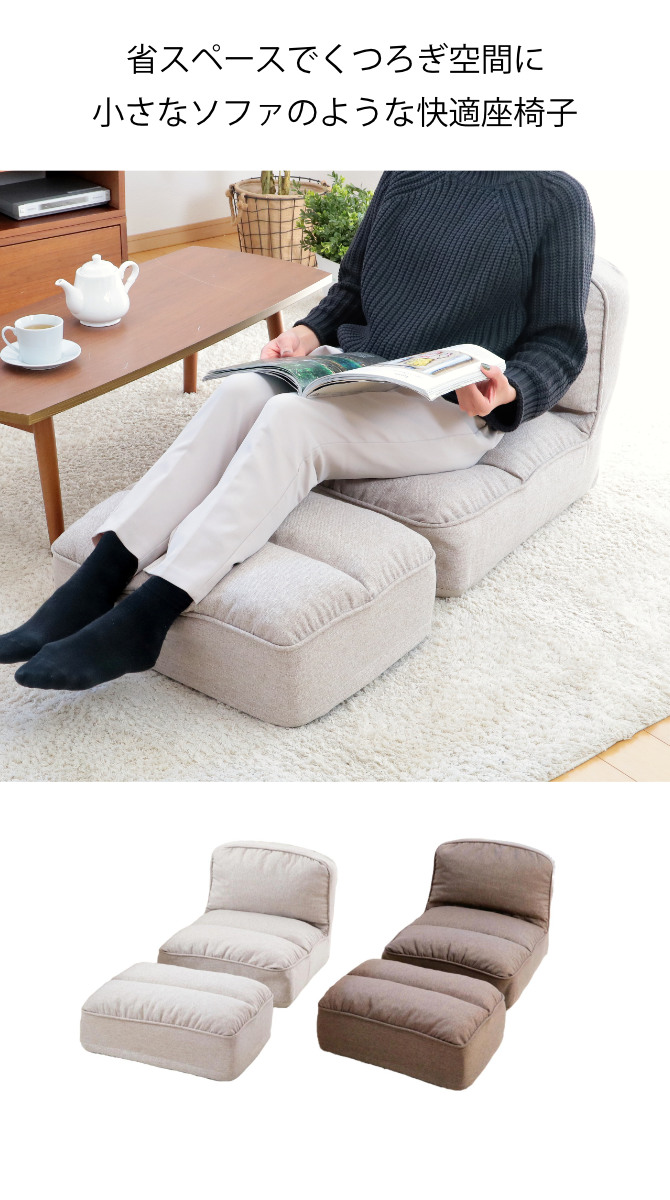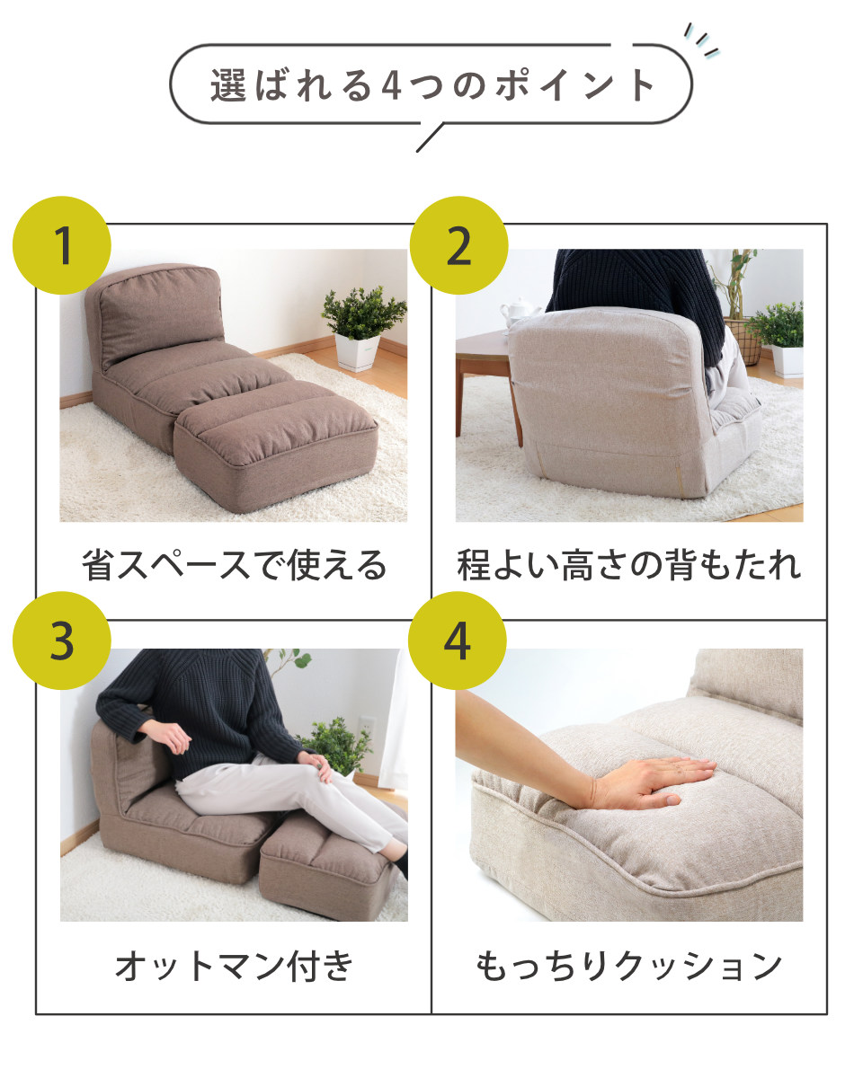 足を伸ばしてくつろげる、オットマン付きの座椅子です。ソファのような座り心地を持ちつつ、限られたスペースでお使いいただけるコンパクト設計。「大きなソファは置けないけれど、背もたれのある座椅子でくつろぎたい…!」という方にぴったりです。