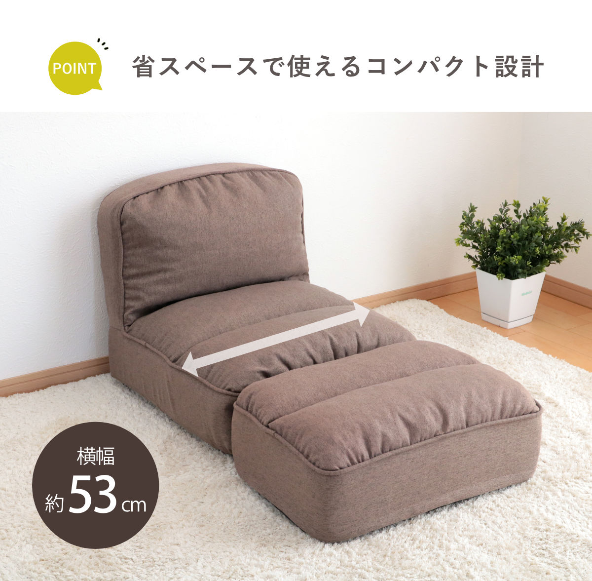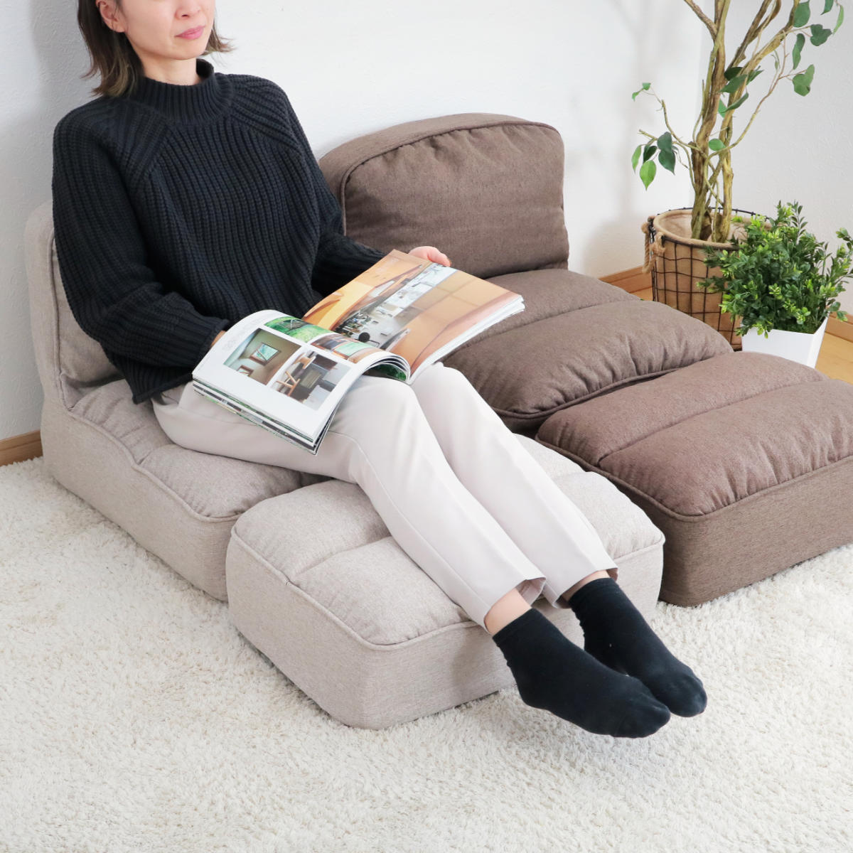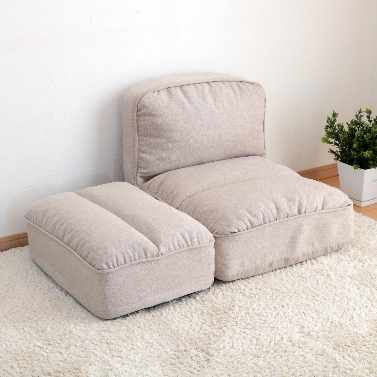 足を伸ばしてくつろげる、オットマン付きの座椅子です。ソファのような座り心地を持ちつつ、限られたスペースでお使いいただけるコンパクト設計。「大きなソファは置けないけれど、背もたれのある座椅子でくつろぎたい…!」という方にぴったりです。