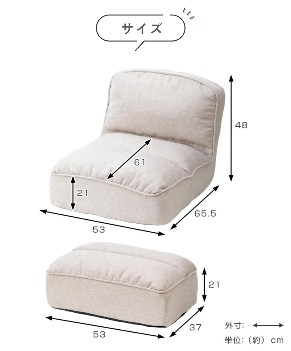 | サイズ | 【座椅子】約 幅53×奥行65.5×高さ48(cm) 座面:約 奥行61×高さ21(cm) 【オットマン】約 幅53×奥行37×高さ21(cm) |