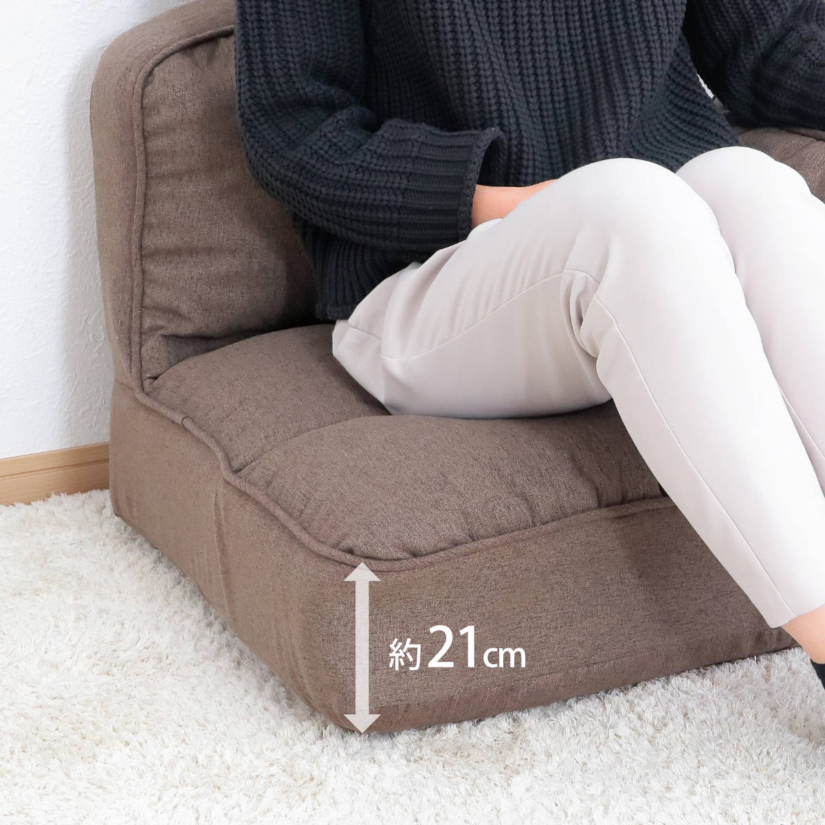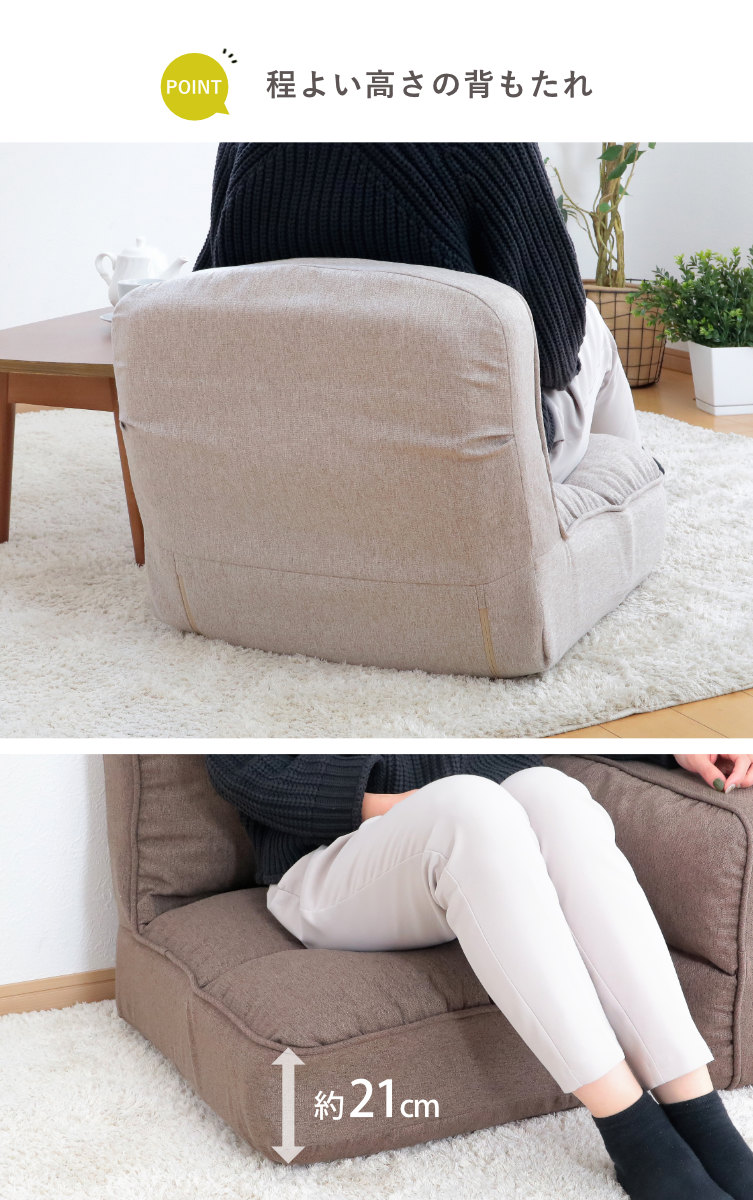 背もたれは少し低めに作られているので安定感があり、骨盤の部分をしっかり支えてくれます。また、座面高は21cmと高めなので、座る・立つの動作がラクです。