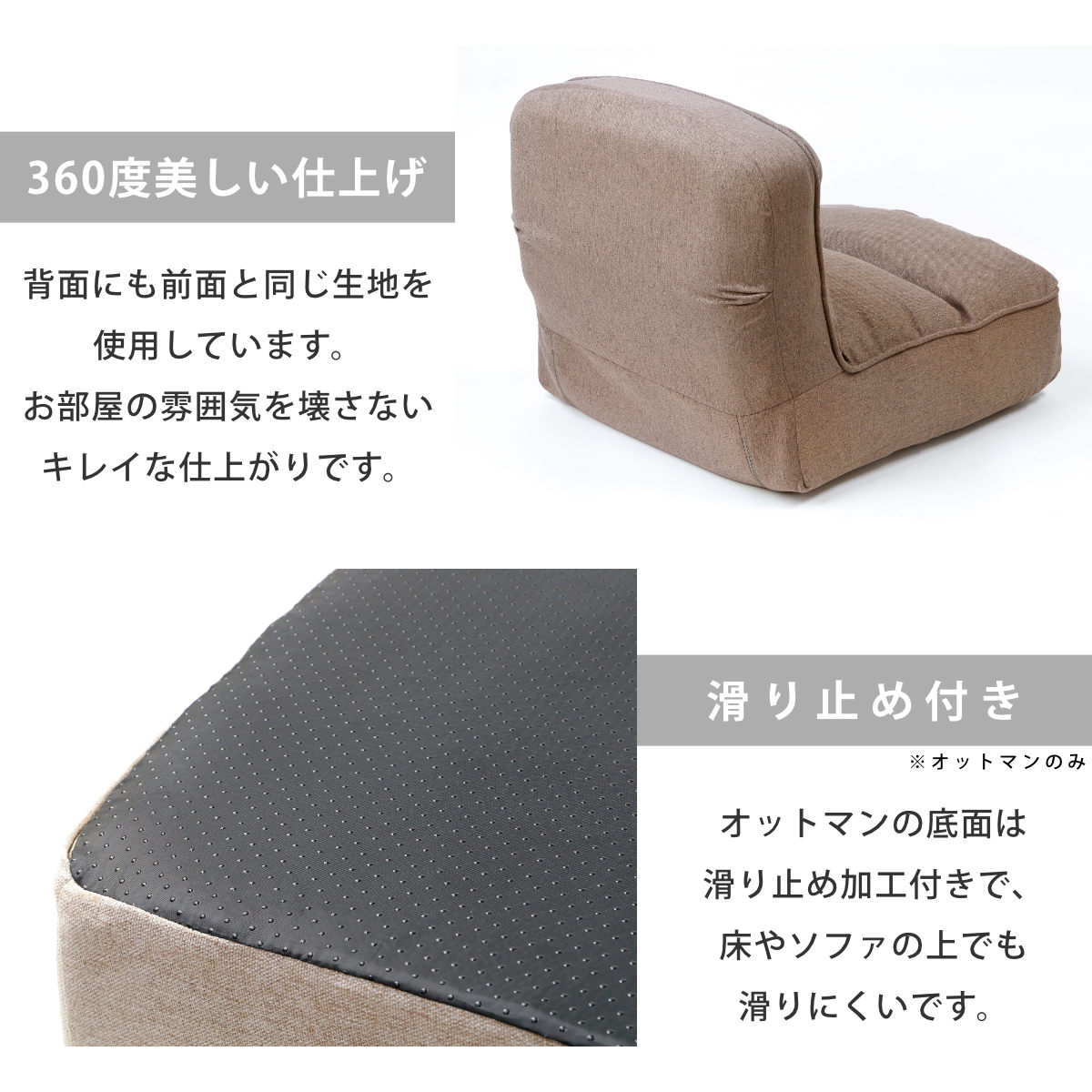 | 注意事項 | ※座椅子の背もたれは、折り畳み動作のみで、リクライニングは出来ません。 ※座椅子、オットマンともに、カバーの取り外し、洗濯は出来ません。 |