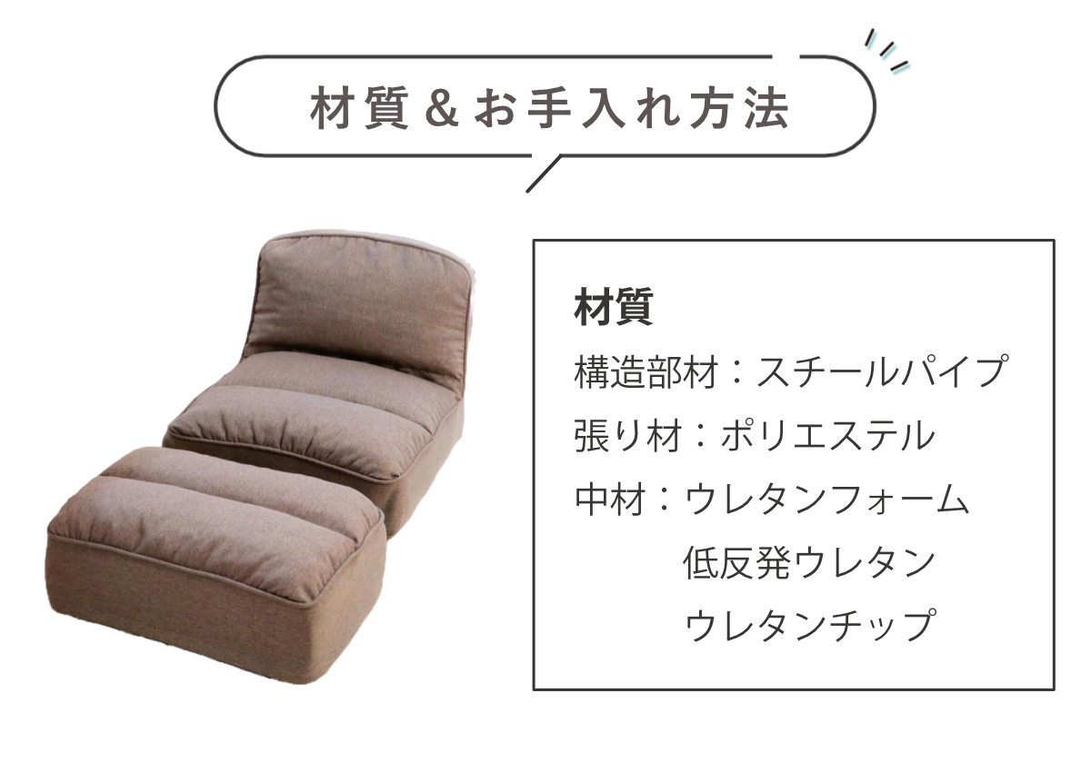 | 材質 | 構造部材:スチールパイプ 張り材:ポリエステル 中身:ウレタンフォーム、低反発ウレタン、ウレタンチップ |