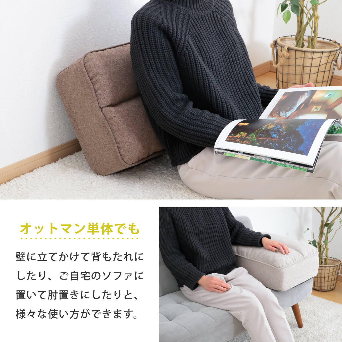 オットマンは、足を乗せてくつろげるのはもちろん、座椅子の横に立てて肘置きにしたり、座面の横に並べて、座面を広くしてお使いいただくことも可能です。角型のシンプルな形だから使い方も自由自在、いつでも快適な姿勢でくつろげます。