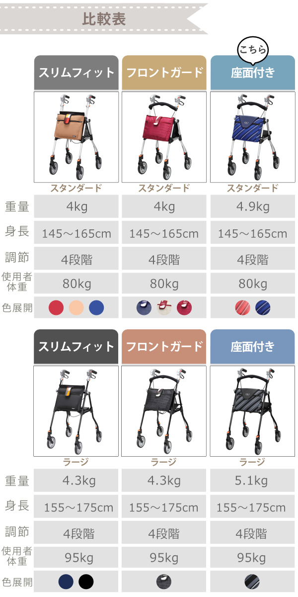 ![]() スリムフィット スタンダード | ![]() フロントガードタイプ スタンダード | ![]() 座面付きタイプ スタンダード 【▲このページの商品】 |