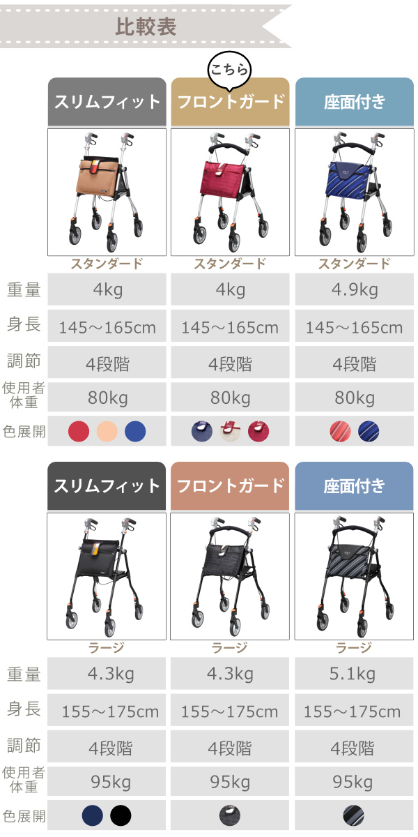 ![]() スリムフィット スタンダード | ![]() フロントガードタイプ スタンダード 【▲このページの商品】 | ![]() 座面付きタイプ スタンダード |