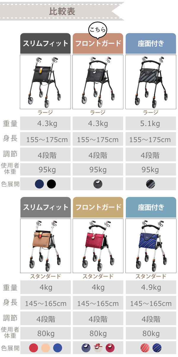![]() スリムフィット スタンダード | ![]() フロントガードタイプ スタンダード | ![]() 座面付きタイプ スタンダード |