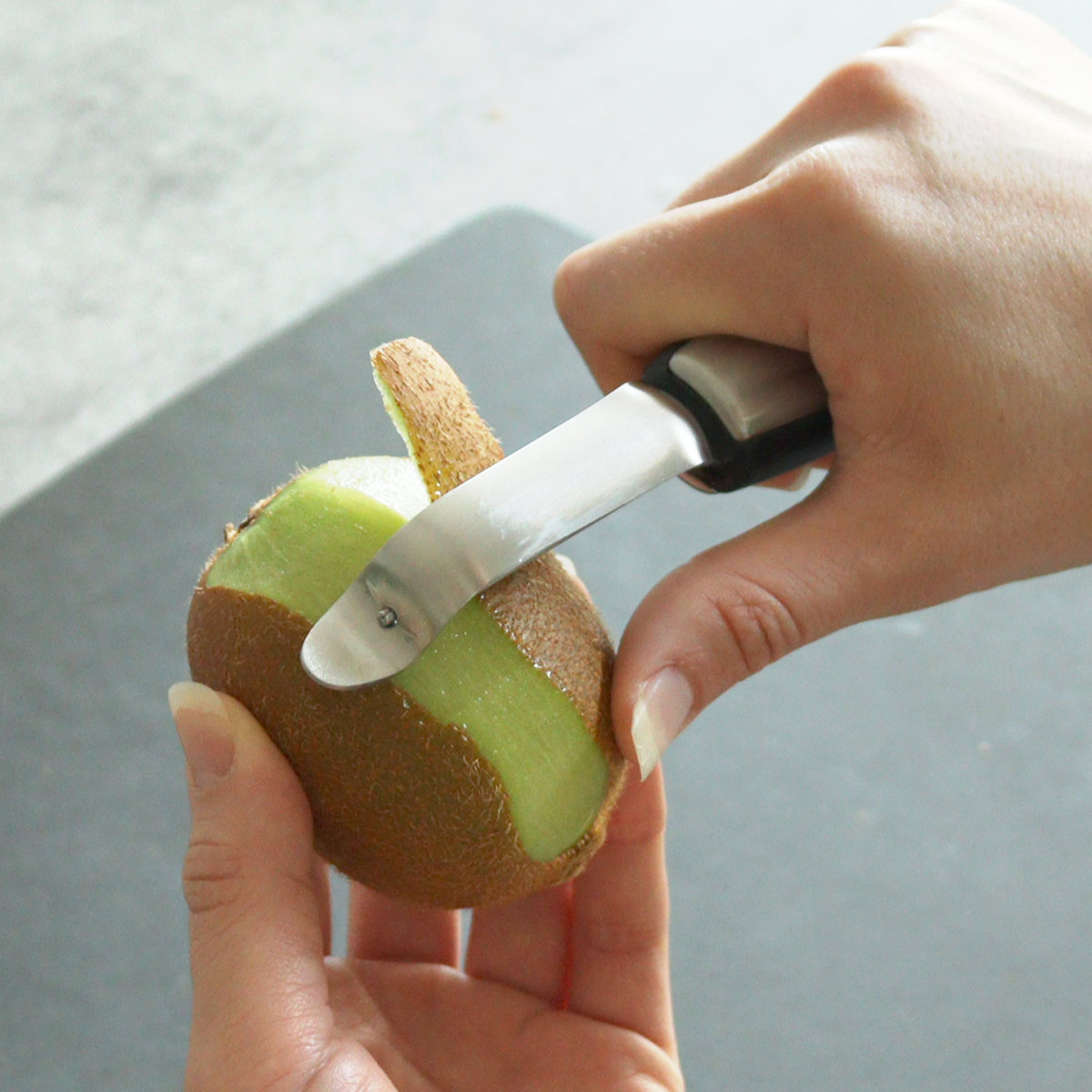 グリップ側面がラバー素材で覆われており、滑りにくく、濡れた手でも剥きやすいです。また凹凸がないので汚れが溜まらず、お手入れもしやすいです。(食洗機使用OK)