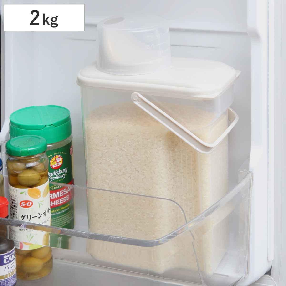 スリムタイプでドアポケットにも入る。冷蔵庫保存に便利な米びつ