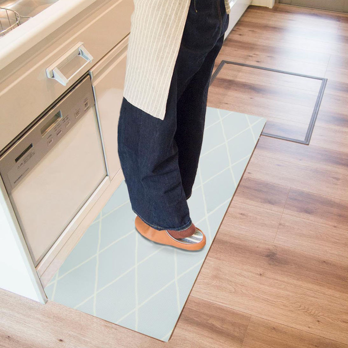 クッション性のあるやわらかい踏み心地が気持ちいいマットです。思わず足踏みしたくなるようなぷにぷにの感触で、立ち仕事による足腰の疲れを軽減します。また、物が落下しても衝撃を吸収し、傷や凹みからフローリングを守ってくれます。