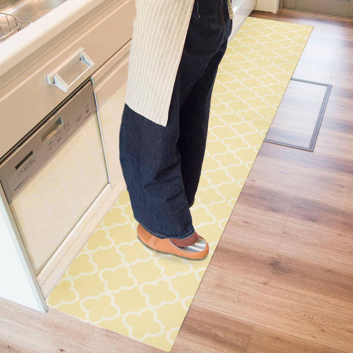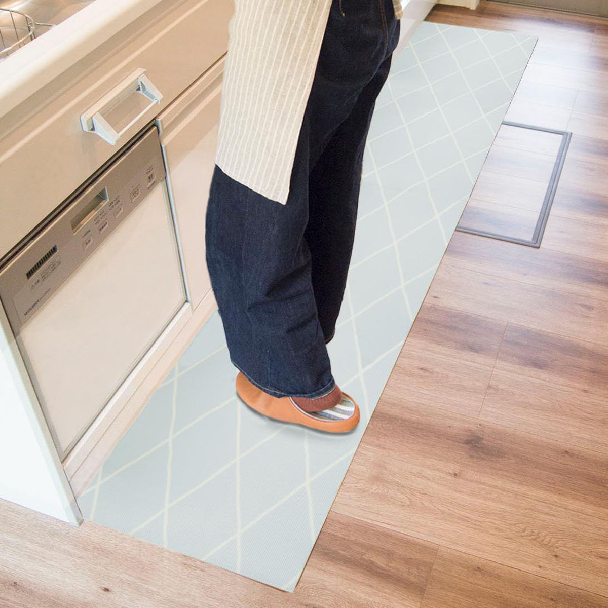 クッション性のあるやわらかい踏み心地が気持ちいいマットです。思わず足踏みしたくなるようなぷにぷにの感触で、立ち仕事による足腰の疲れを軽減します。また、物が落下しても衝撃を吸収し、傷や凹みからフローリングを守ってくれます。