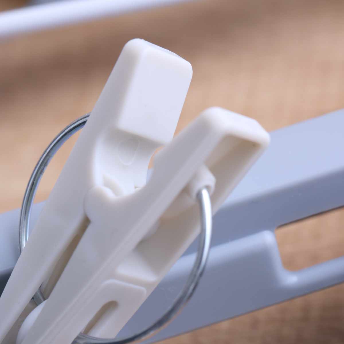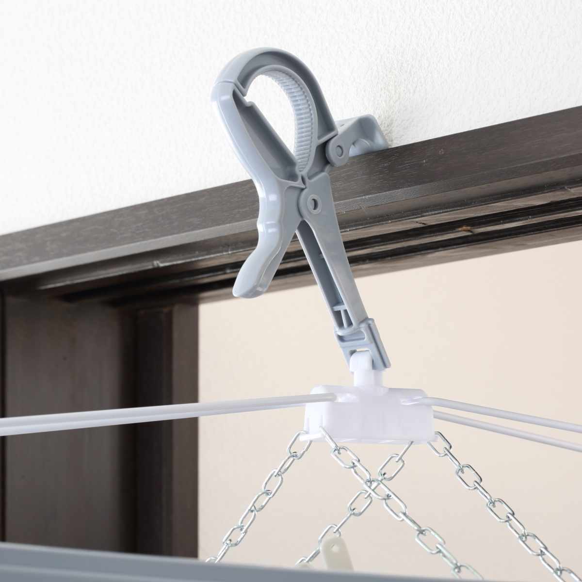 物干し竿や洗濯ロープにしっかり固定できるキャッチ式。風が強い日でも安心して干すことができます。室内干しでカモイに掛けられるカモイフックも付いているので便利です。