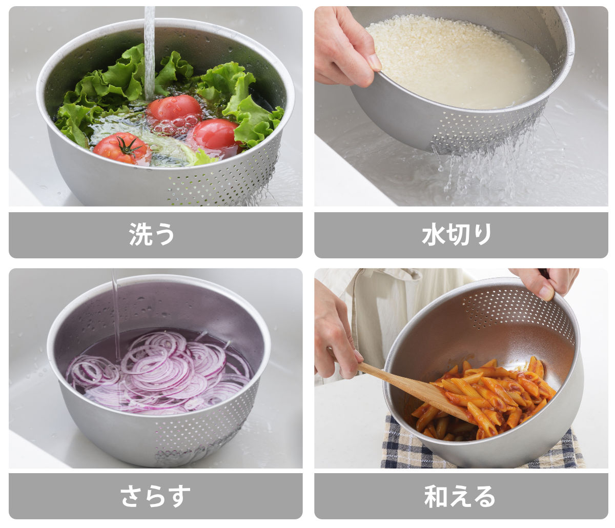 水を流しながら野菜や果物を洗ってもあふれません。乾物を戻す際や、そうめんを流水でしめるときにも便利で、下ごしらえがスムーズに進みます。ひとつあれば「洗う」「水切り」「さらす」「和える」まで幅広く活用できます。