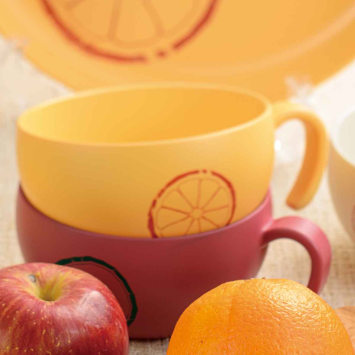 フルーツのイラストがアクセントになっている「フルン」シリーズです。軽くて割れにくいので扱いやすく、大人も気軽に使いやすいカラーが魅力です。リンゴ、スイカ、オレンジのフルーツ柄が描かれた食器で毎日の食卓をより楽しくできそうです。
