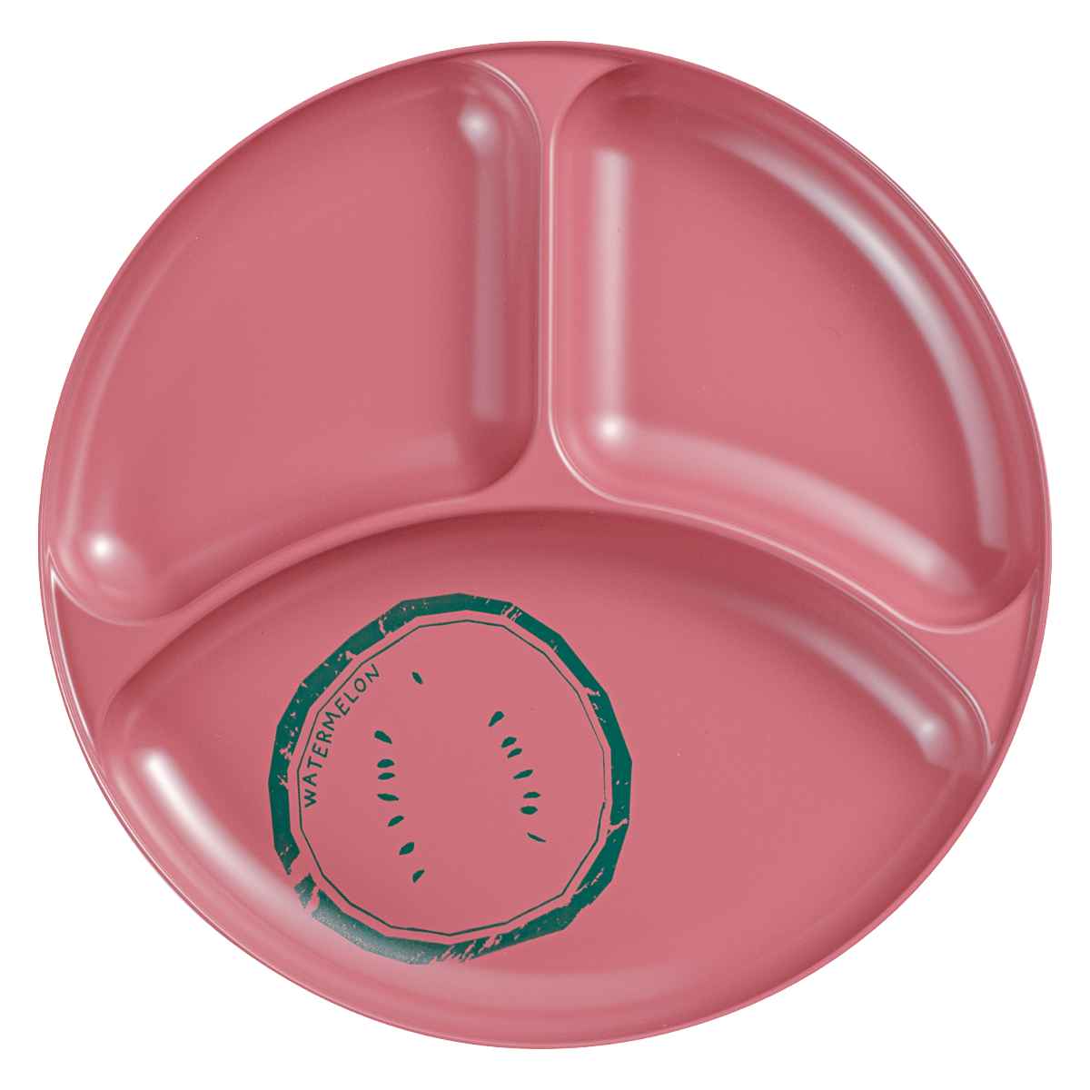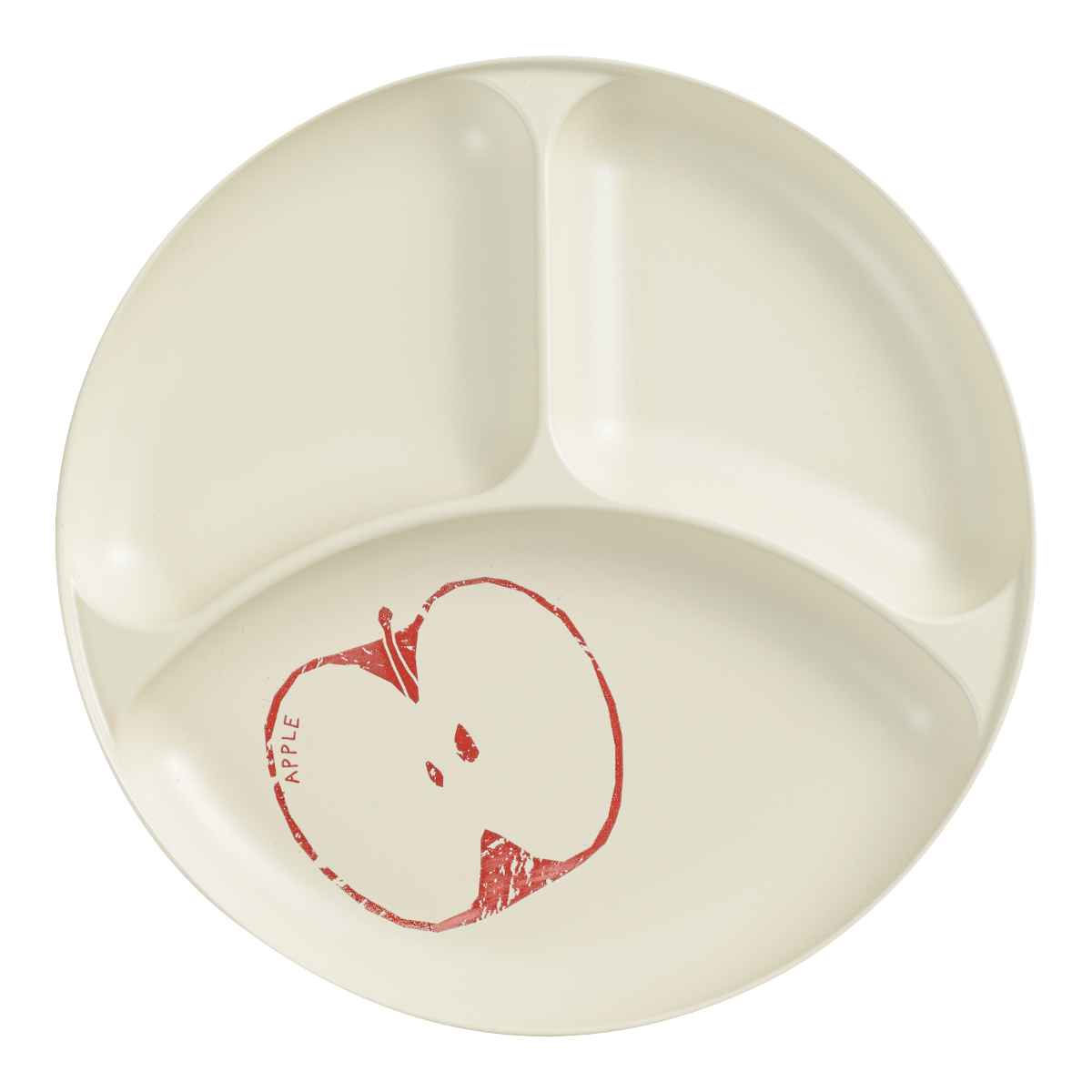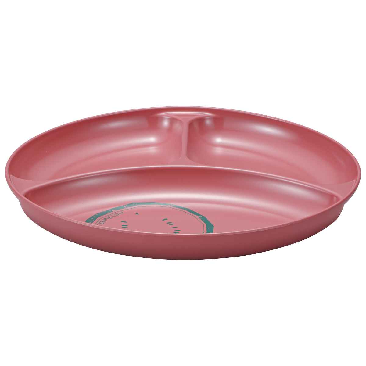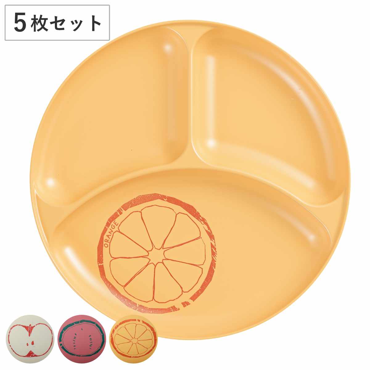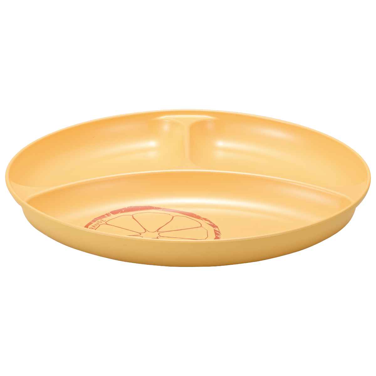 フルーツ柄が愛らしいデザインの、抗ウイルス・抗菌加工を施したプレートです。ごはんとおかず、デザートなどを一緒に盛り付けができる仕切り付きです。食べ物がすくいやすい設計です。