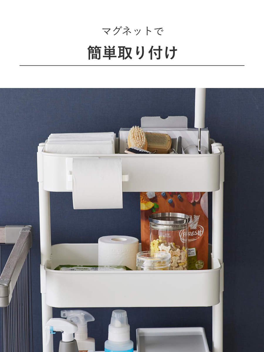 マグネットで取り付けるだけの簡単設置です。スチール製のワゴンにはもちろん、冷蔵庫などにも取り付けできます。