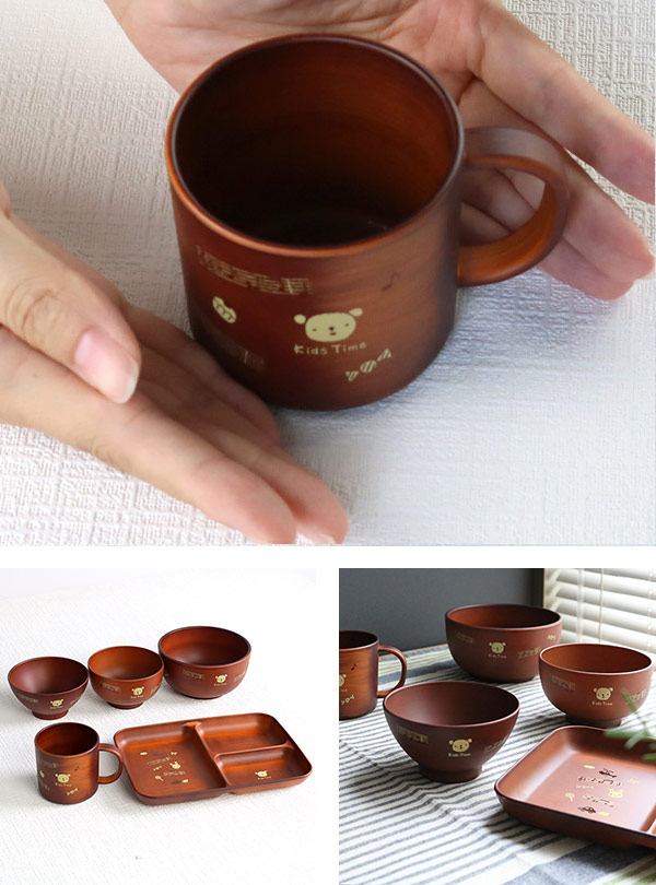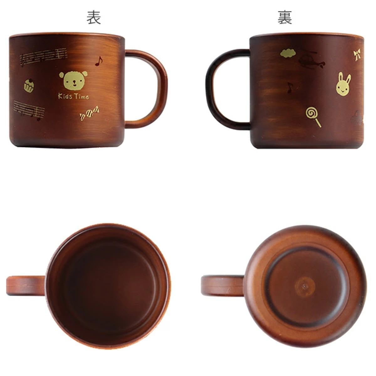 お子様の食事にピッタリな軽くて割れにくい木製風のコップです。かわいいくまさんやうさぎちゃんのイラストが描かれています。表面は熱や汚れに強いウレタン塗装でお手入れも簡単です。