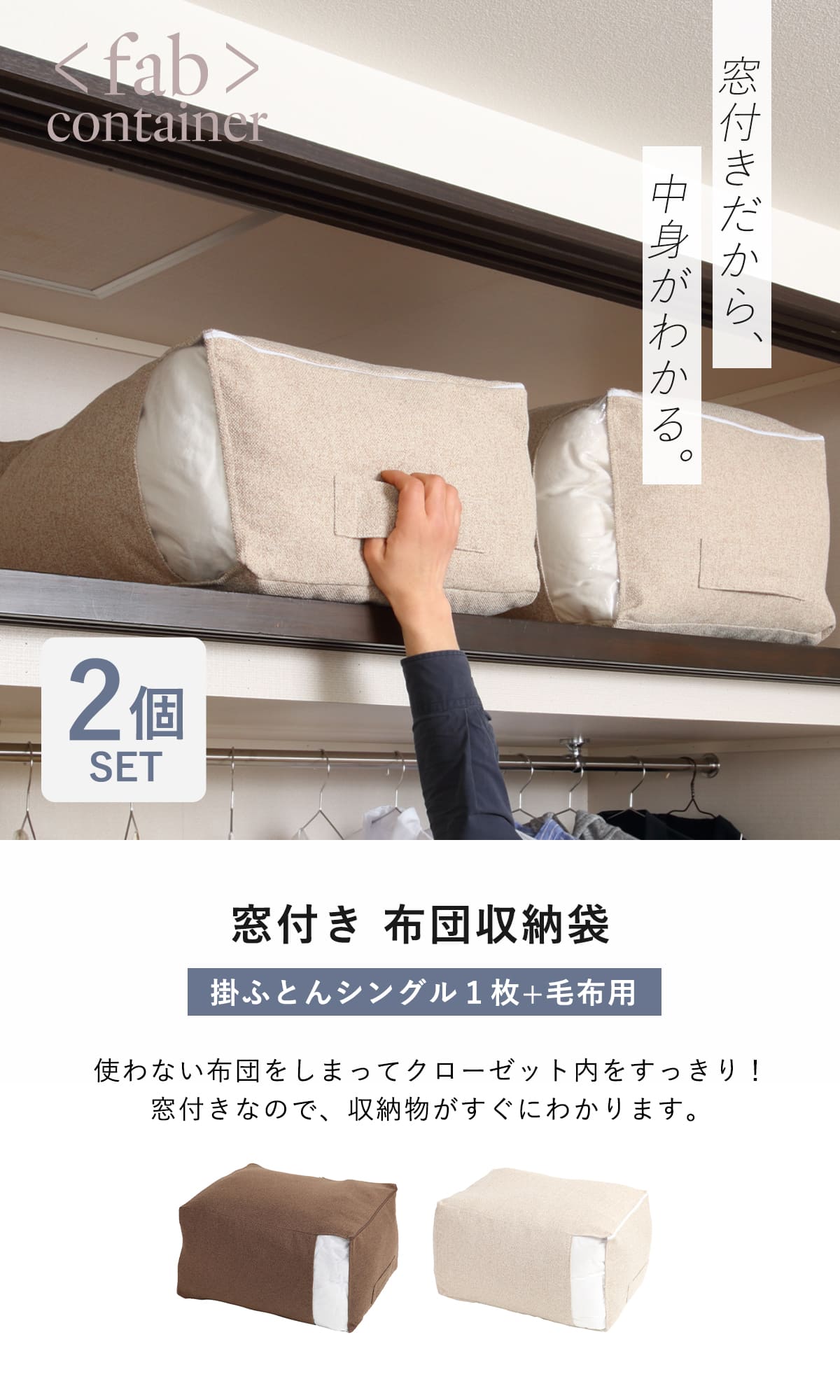 ![]() 窓付きタイプ(シングル掛け布団+毛布用) 単品 | ![]() 窓付きタイプ(シングル掛け布団+毛布用) 2個セット 【▲このページの商品】 |