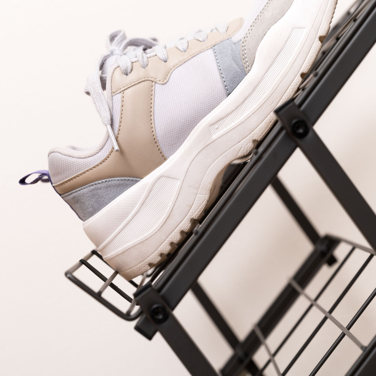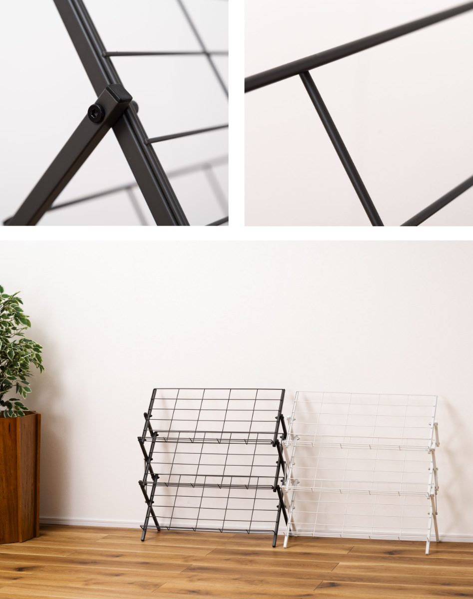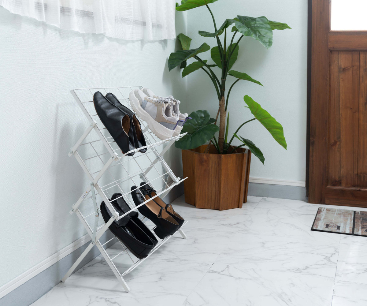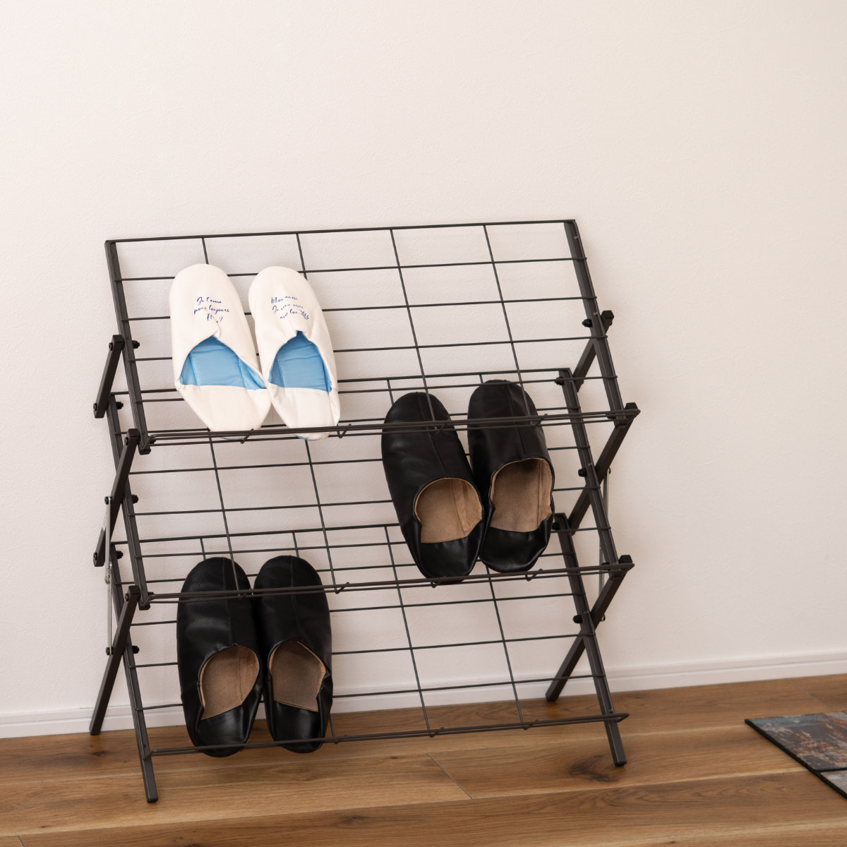 スタイリッシュなスチール製シューズラックです。下駄箱を置きたくないけれど、雑多にしたくないという時に最適なシューズラック。玄関に広がる靴たちを、すっきり省スペースで整頓できます。また、メインの下駄箱に入り切らなかった分のサブ収納スペースとしても便利です。