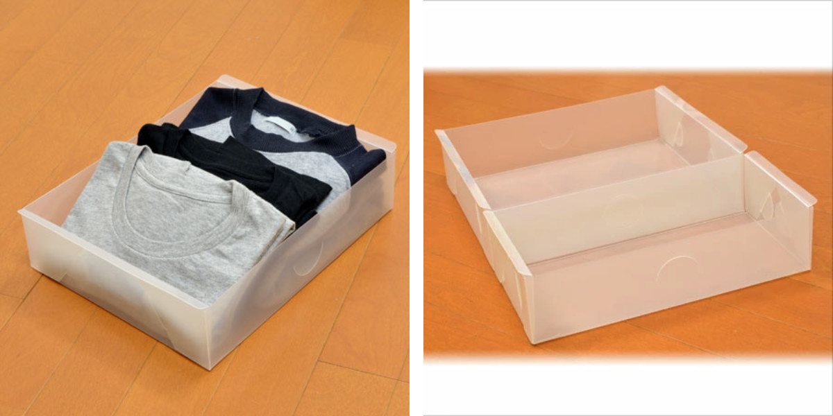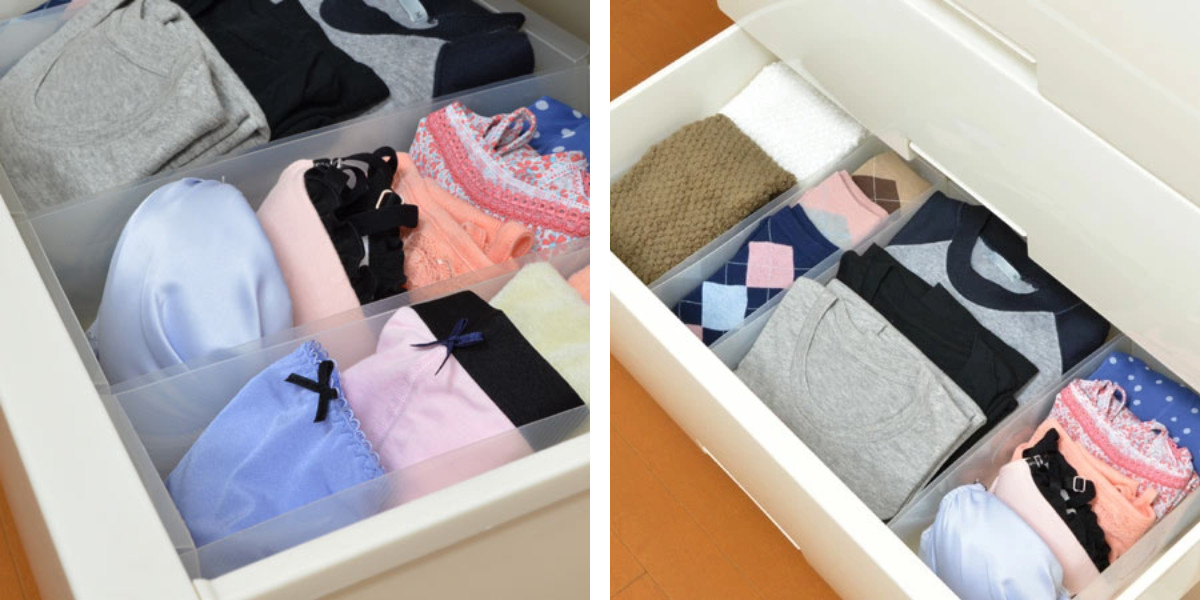 引出し内を間仕切ってピッタリ収納、薄い衣類も難なく整理できる
