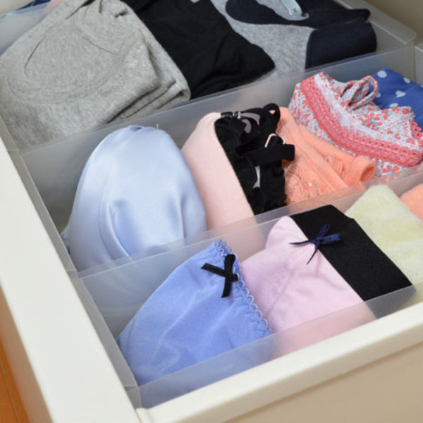 下着やタオル類・衣類を、サイズにあった仕切りケースに収納。引出し内をすっきり整頓できます。