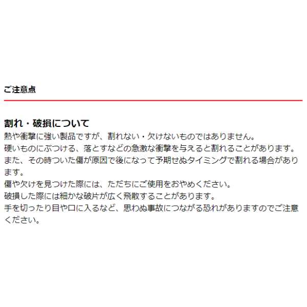 熱や衝撃に強い製品ですが、割れない・欠けないものではありません。