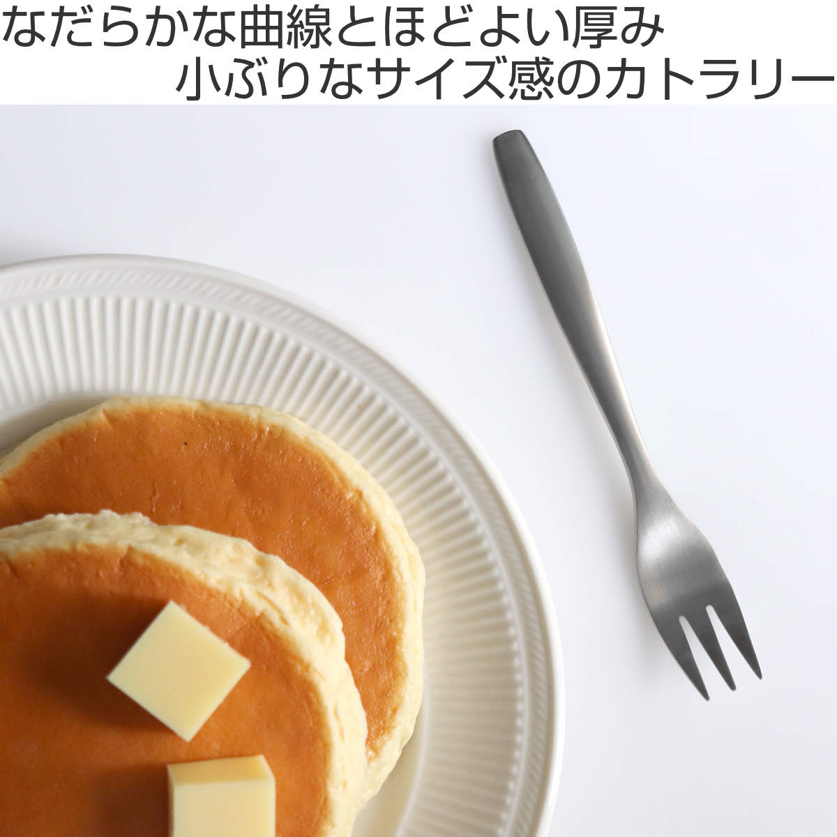 スプーンは3サイズで左からディナーフォーク19cm、デザートフォーク16cm、ヒメフォーク14cmです。シーンに合わせて選べるのでシリーズで揃えれば統一感のあるテーブルコーディネートが完成します。