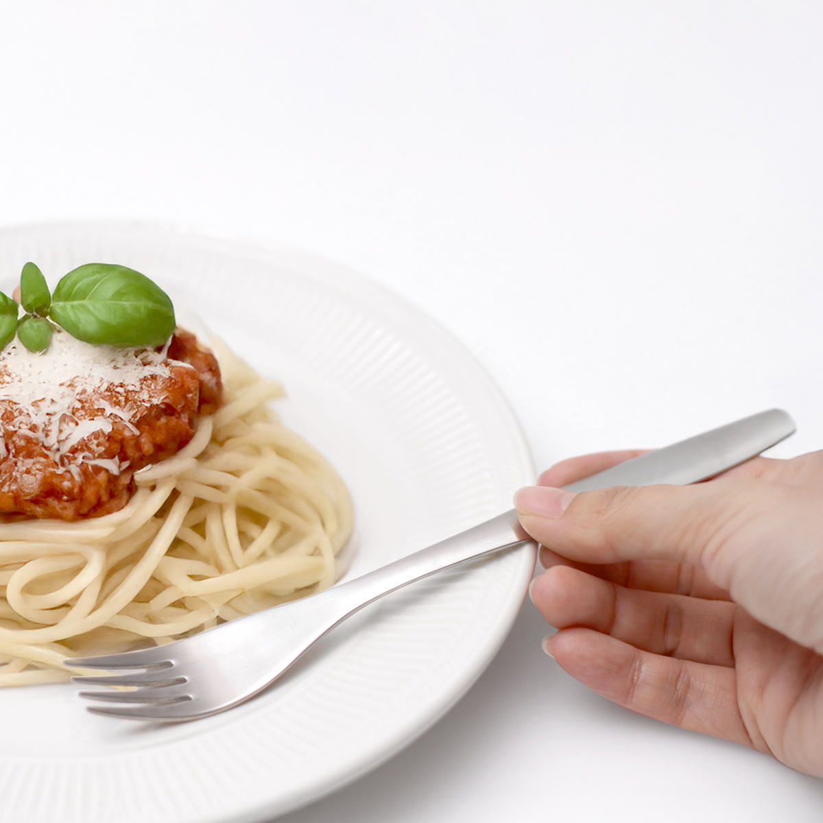 「手に取った瞬間、使った時に満ち足りた感覚になるような、感覚にうったえかけるようなもの」をコンセプトに作られたフォークです。すくいやすさや口当たり、重量バランスにもこだわってつくられています。