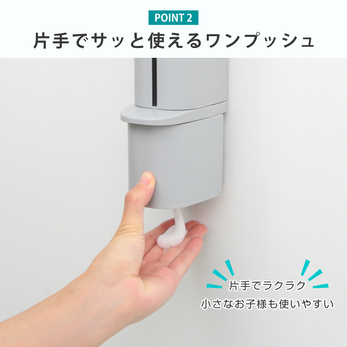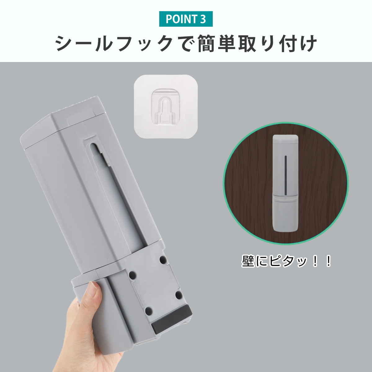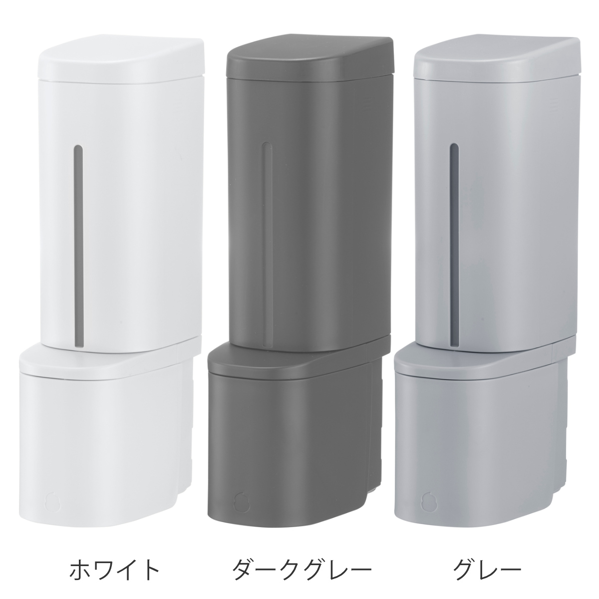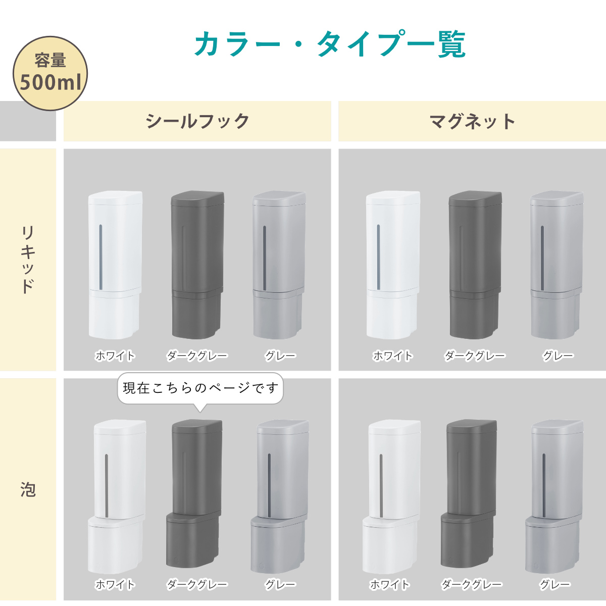 カラーはホワイト・ダークグレー・グレーの3色、タイプはリキッドタイプ・泡タイプの2種類あります。取り付け方法はシールフック・マグネットから選べるため、設置場所や用途に合わせてお選びいただけます。