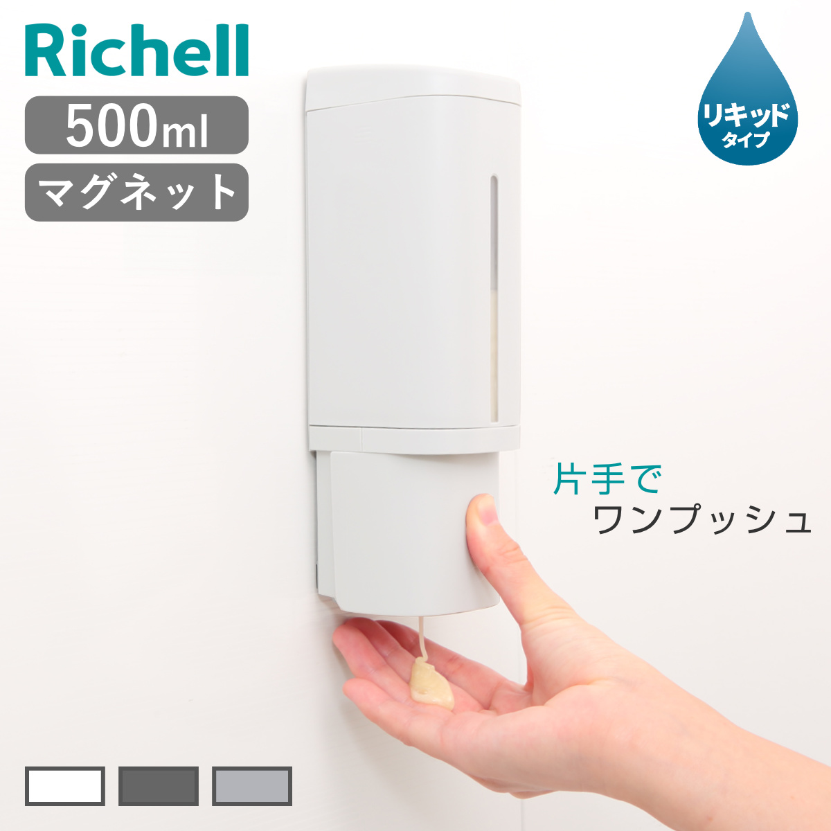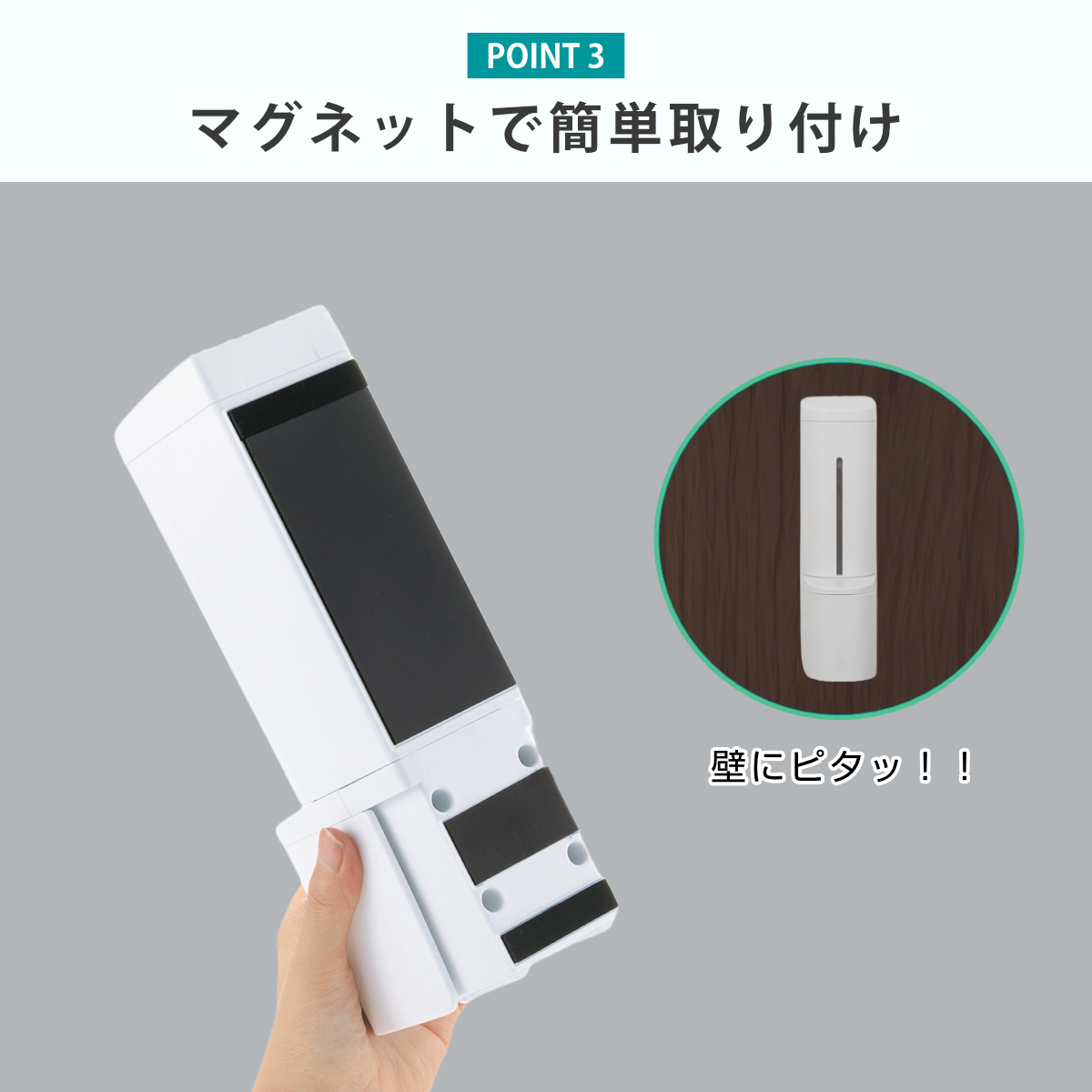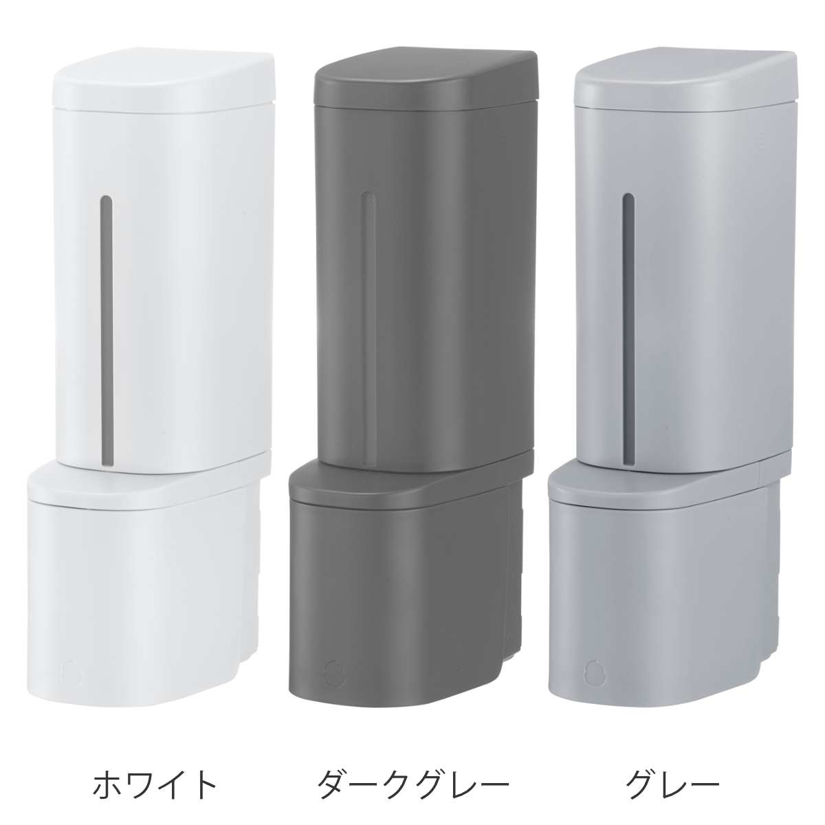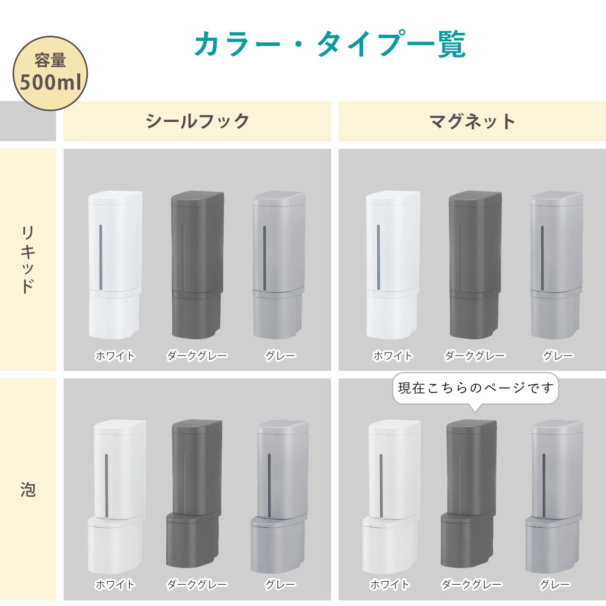カラーはホワイト・ダークグレー・グレーの3色、タイプはリキッドタイプ・泡タイプの2種類あります。取り付け方法はシールフック・マグネットから選べるため、設置場所や用途に合わせてお選びいただけます。