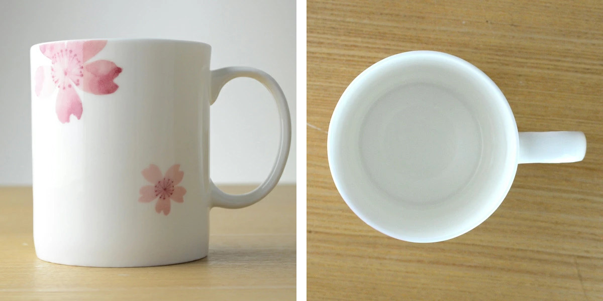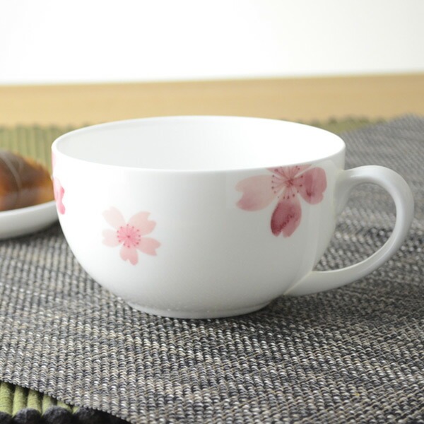 温かみのある乳白色と滑らかな質感、美しい透過性が特徴の最高級磁器「ボーンチャイナ製」。水彩調の淡い落ち着いた桜のデザインで幅広い世代の方に好まれます。容量が380mlと大きめサイズなので、職場で、お家で・・・ゆっくりとしたカフェタイムを過ごしていただけます。
