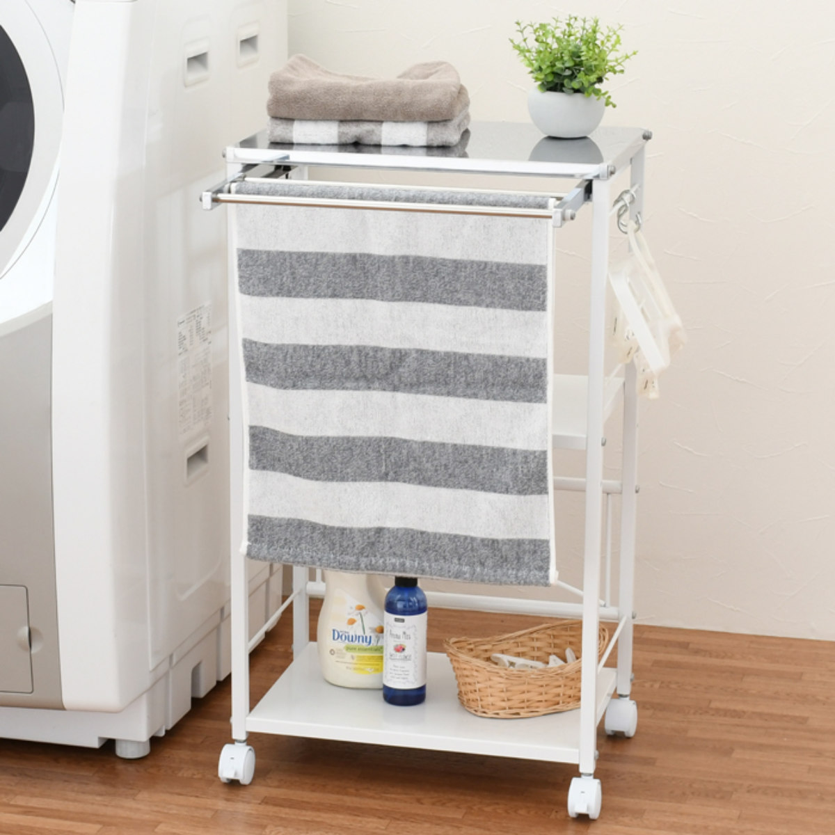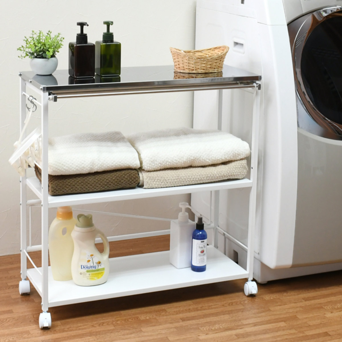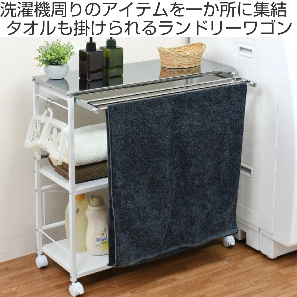 タオル掛けが付いたランドリーワゴンです。タオルなどを干しておいたり、収納の目隠しにも活用できます。耐荷重10kgの棚板なので詰め替え容器などランドリー周辺のアイテムをスッキリしまっておくことができます。