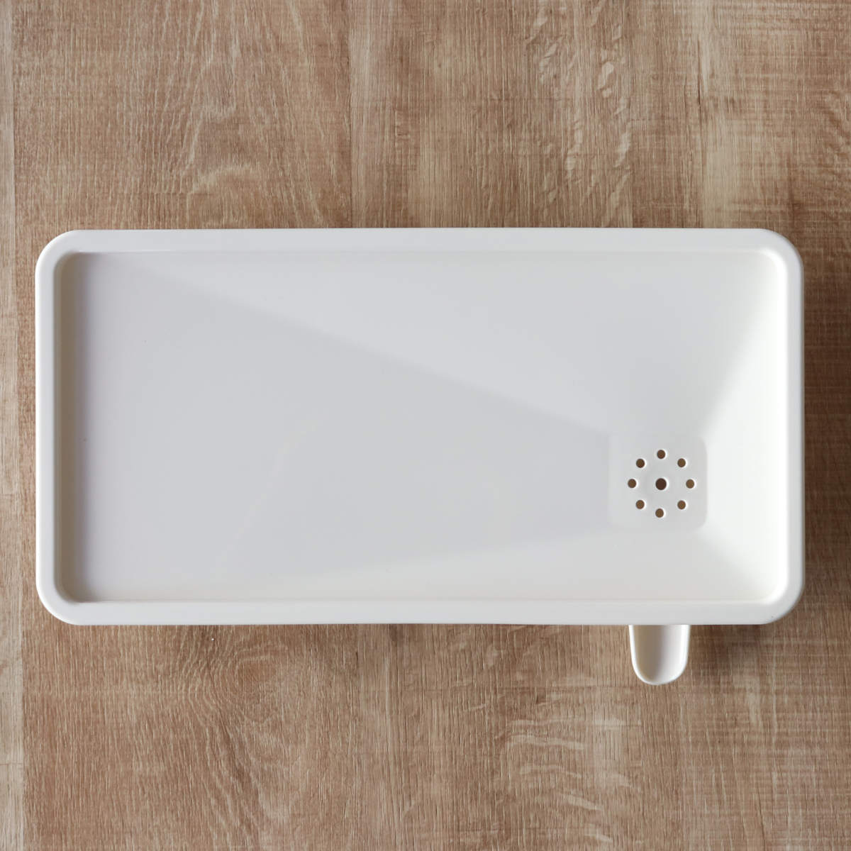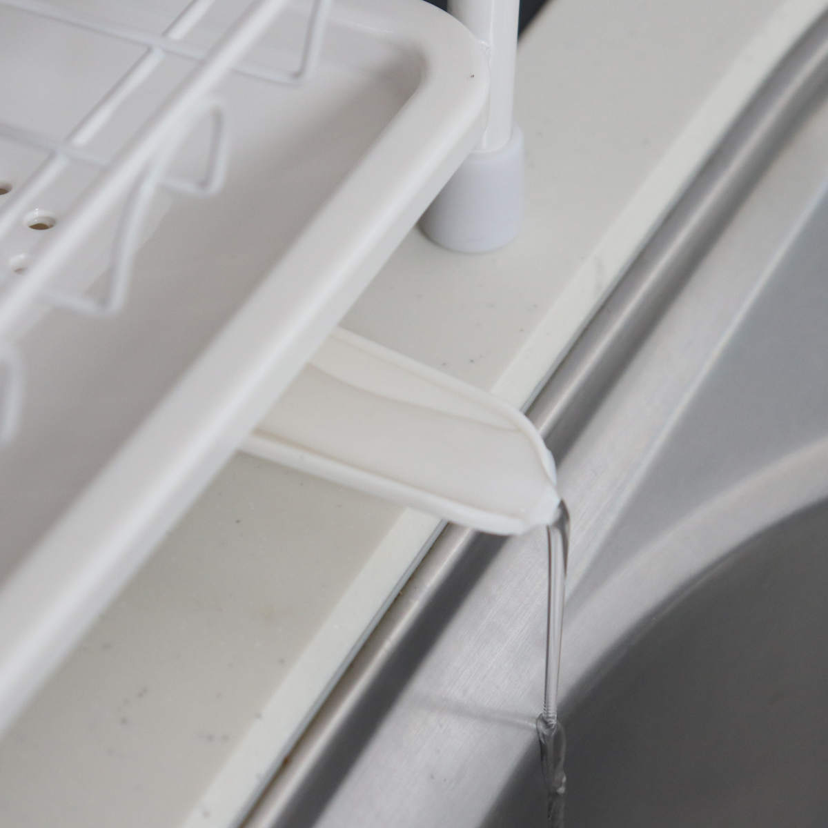 食器から落ちた水は、水受けトレーから排水ノズルへ誘導されてシンクへ排水されます。水捨て不要で常に清潔な状態でお使いいただけます。