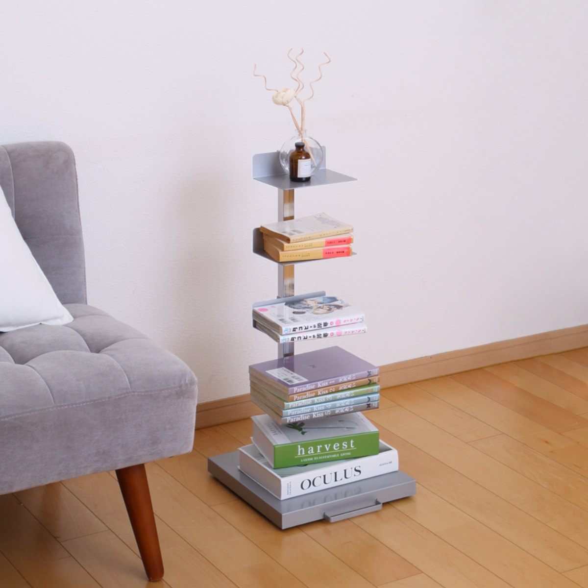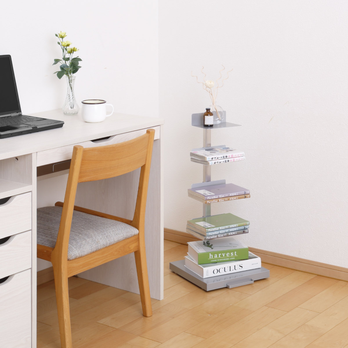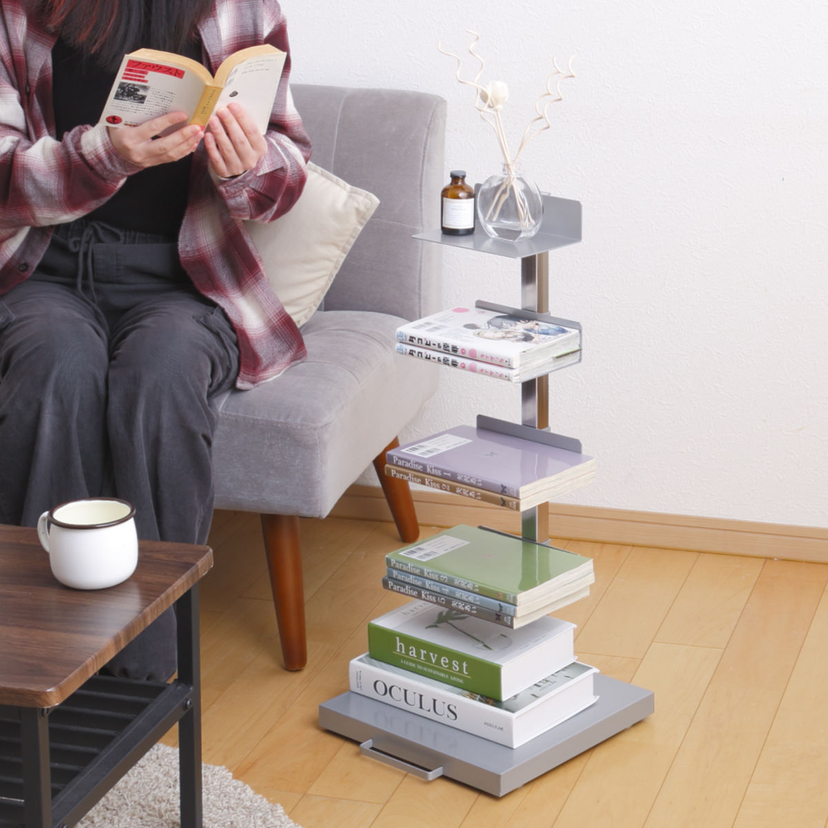読みかけの本や、すぐに手に取りたい小物を置いておけるブックタワーです。縦の空間を有効利用できるので、リビングやベッドサイドなどでお使いいただけて省スペースです。様々なテイストのお部屋に馴染みやすい、圧迫感のないスッキリとしたデザインです。