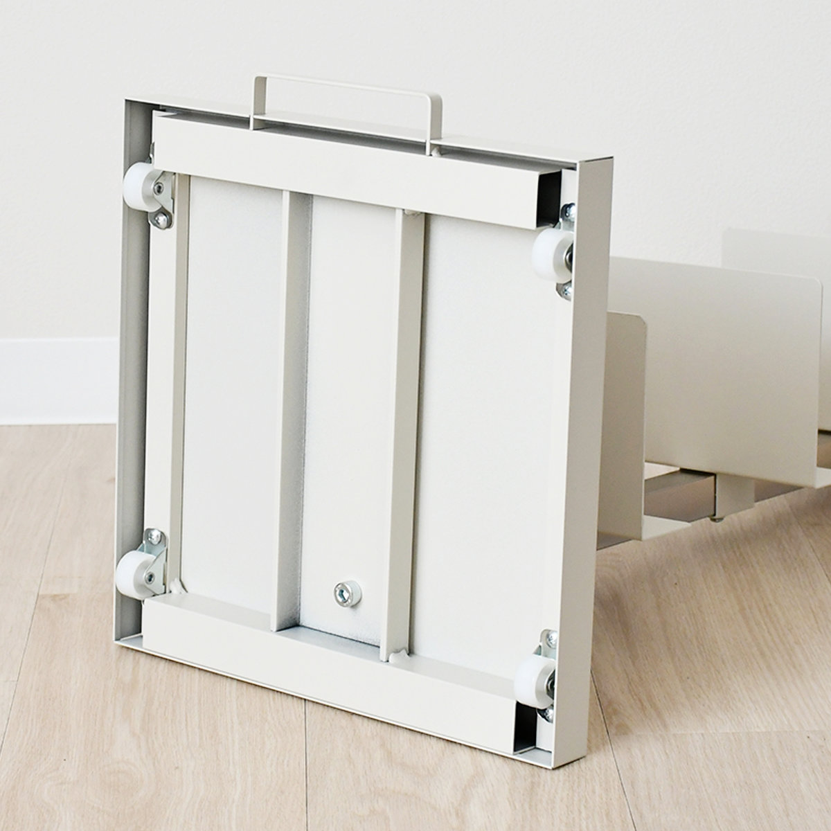 前後に移動ができるキャスター付きです。フロントには取っ手が付いているので、お掃除や模様替えの際の移動が楽ちんです。