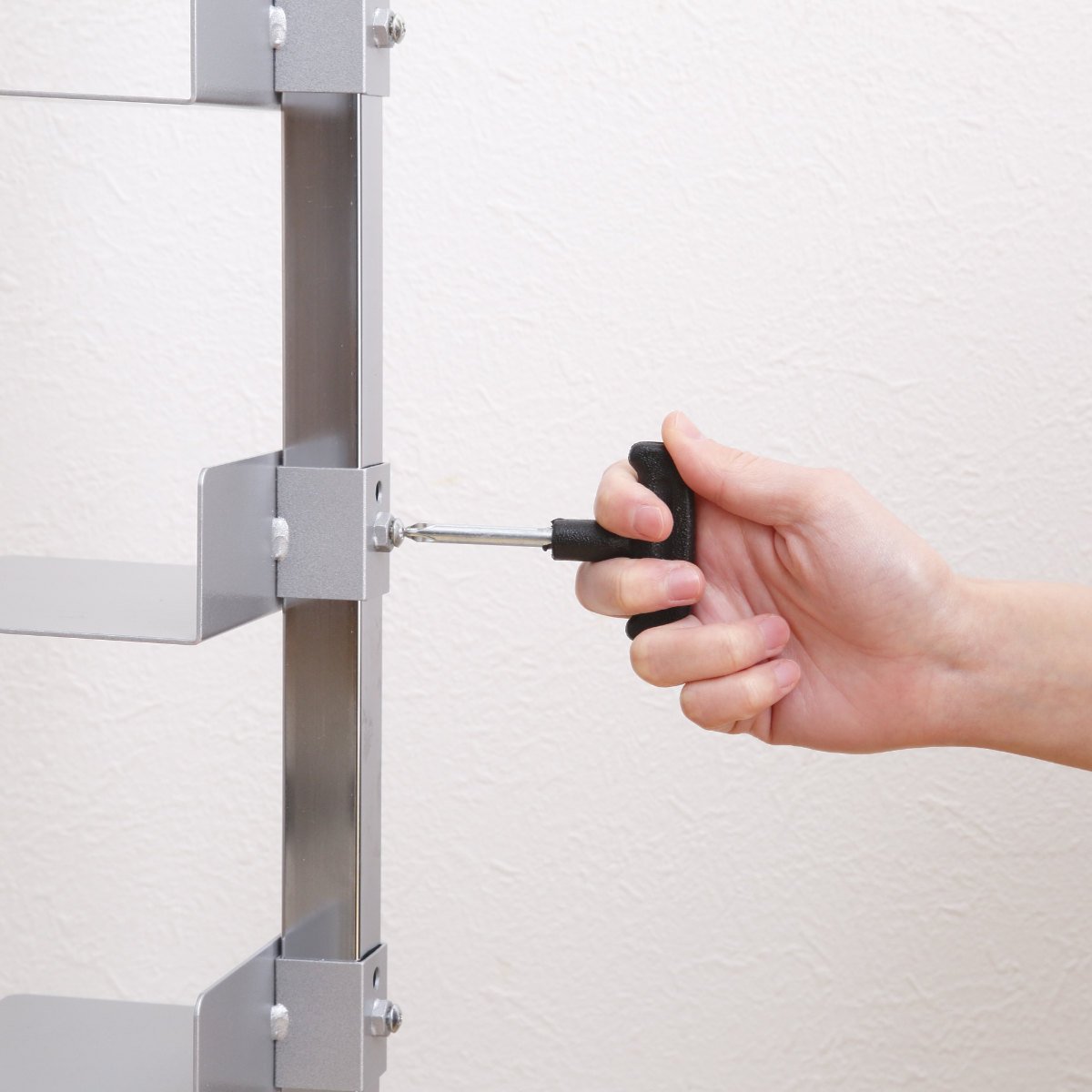 棚板は、置きたいものに合わせて無段階で高さ調節が可能。ビス留め仕様なので、付属のプラスドライバーを使って簡単に調節できます。3方向(正面、左右)に向けて設置ができるので、背の高い花瓶やオブジェのディスプレイを楽しめます。