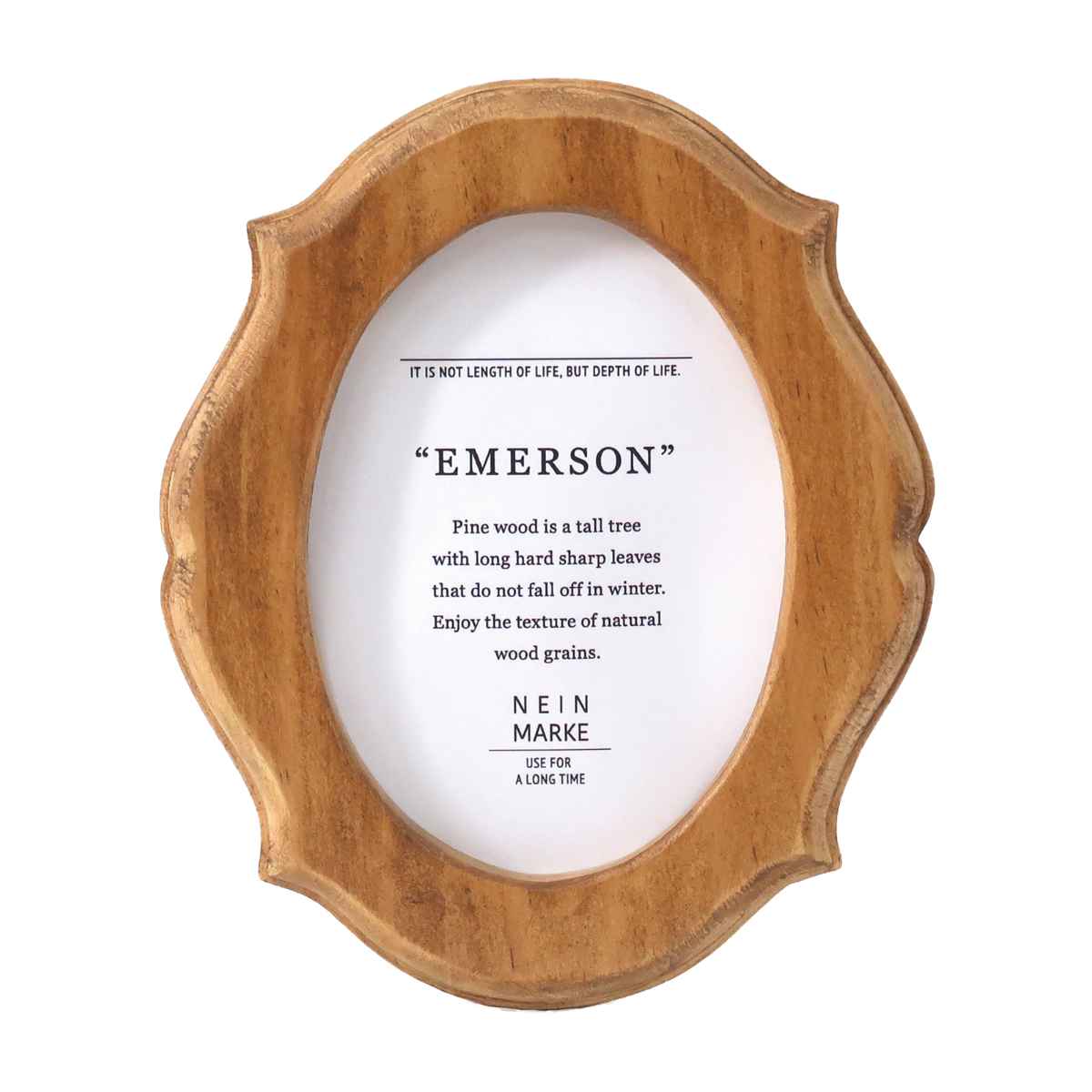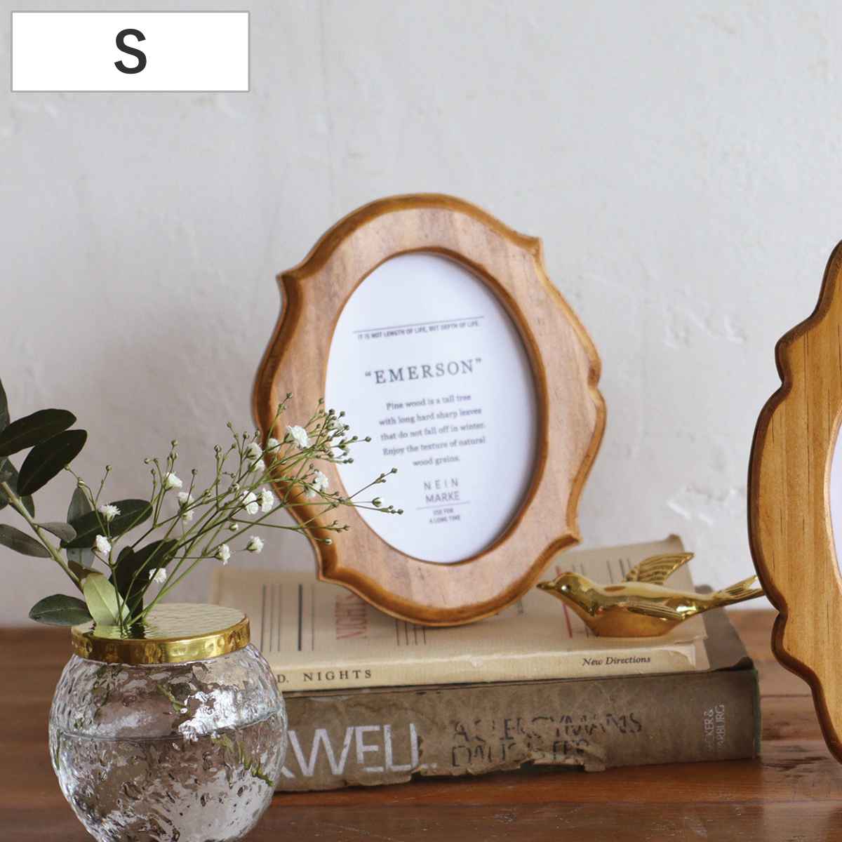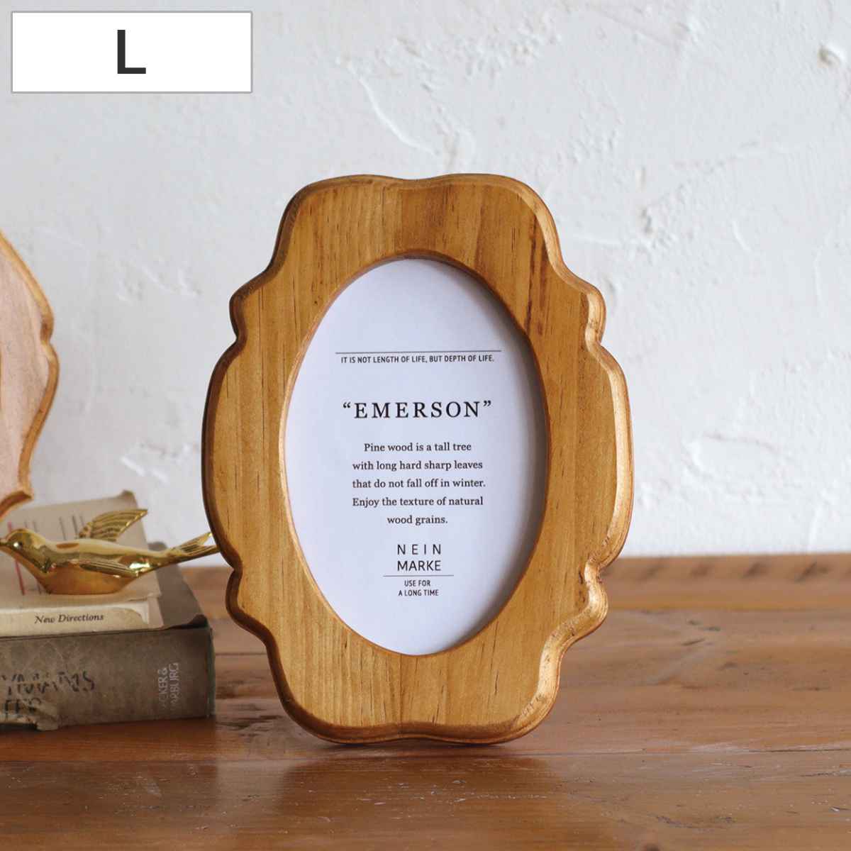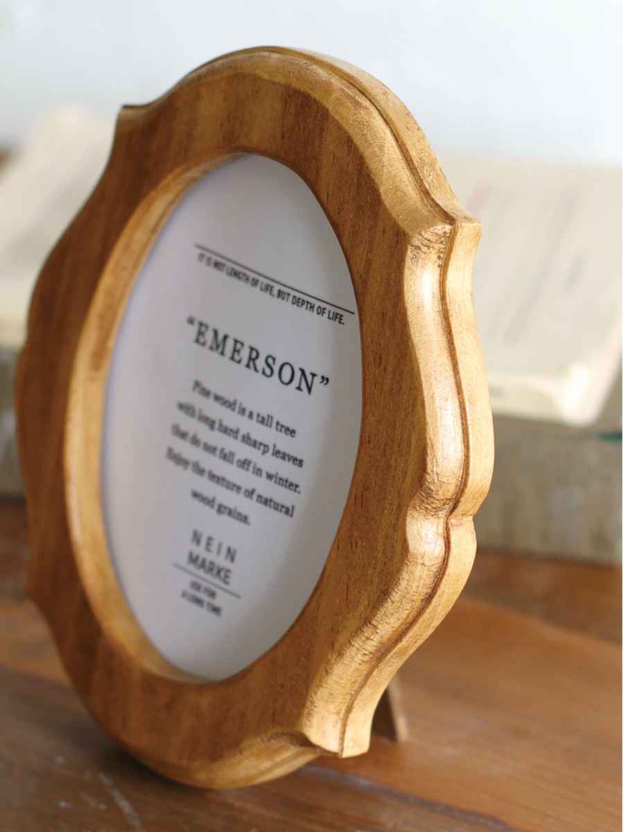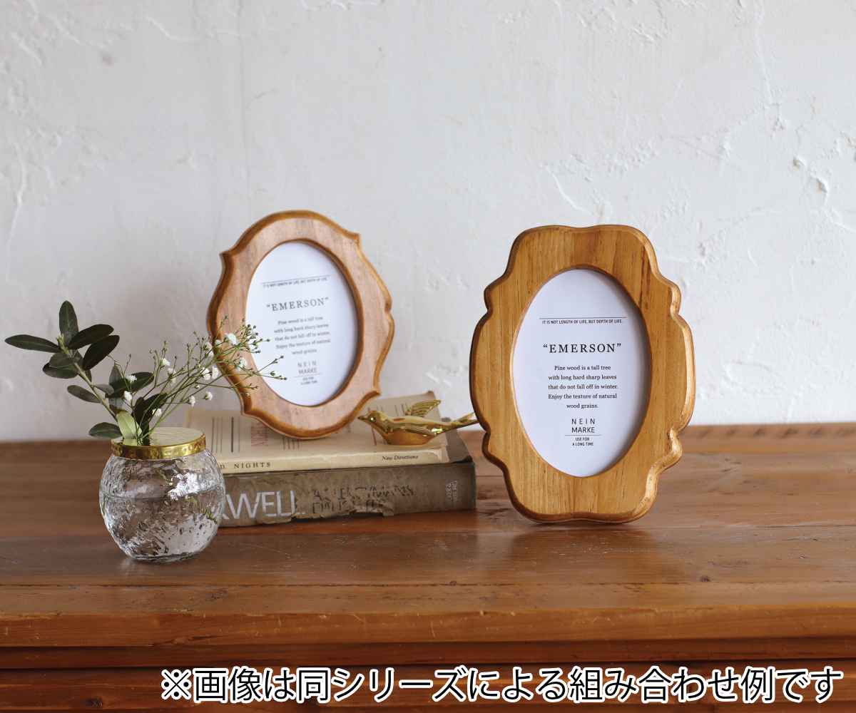 柔らかい曲線と木の温かみを感じさせるスタンドフレームです。背面にスタンドがついており、自立するよう設計されているので、さまざまな場所に飾れます。