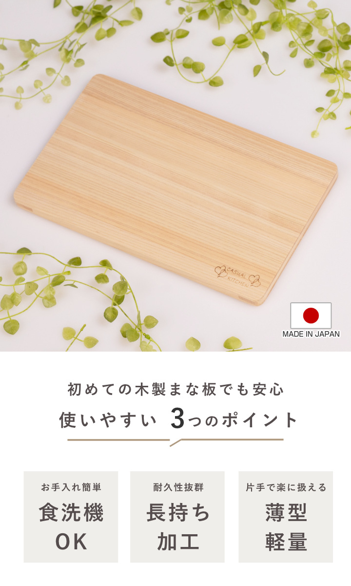 ヒノキは、軽くて、水に強く、よくまな板に使わる素材。本品は軽さにこだわり、食洗機で洗える加工が施されてるので、初めて木製まな板を使う方にオススメな1枚です。