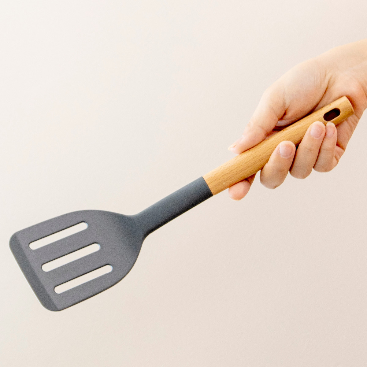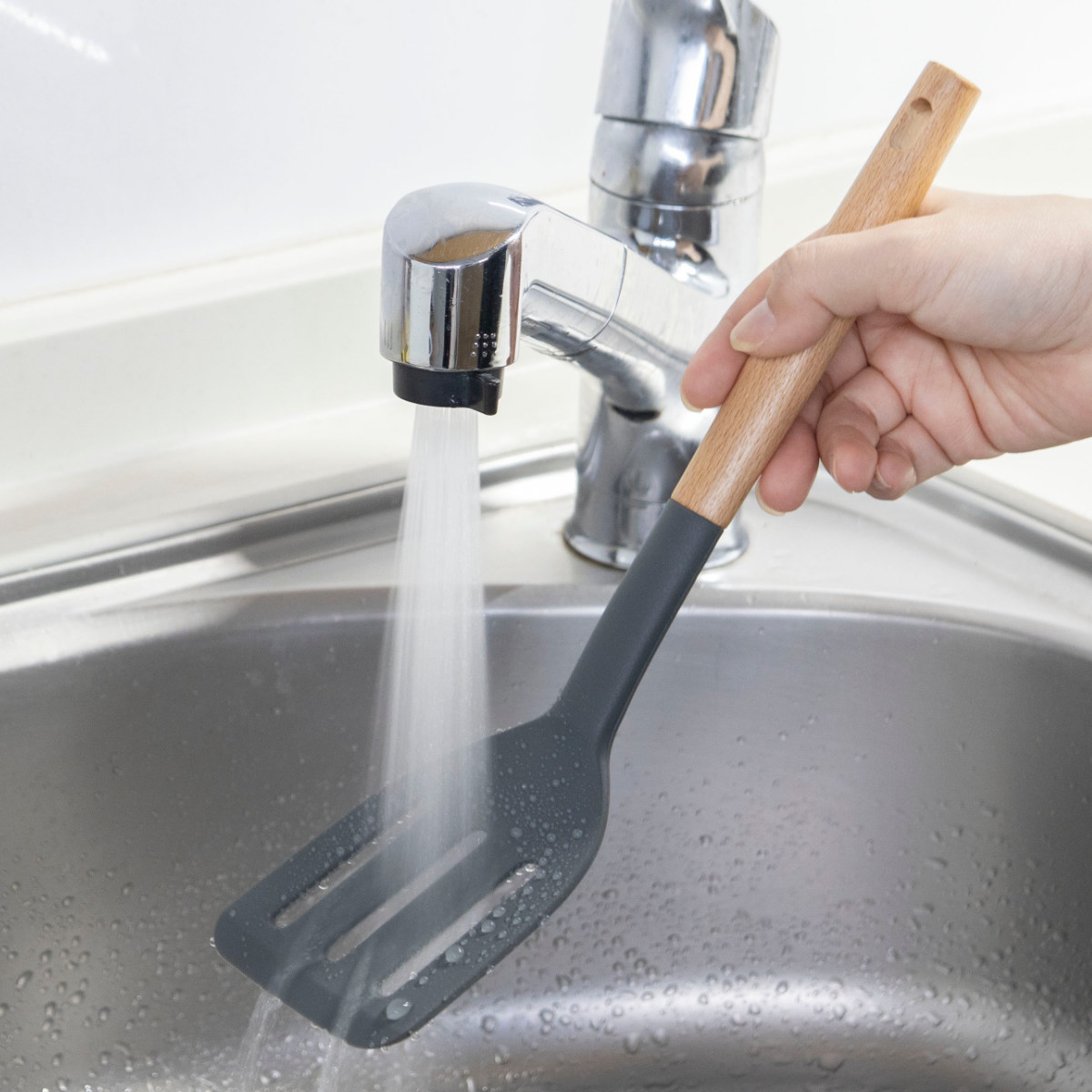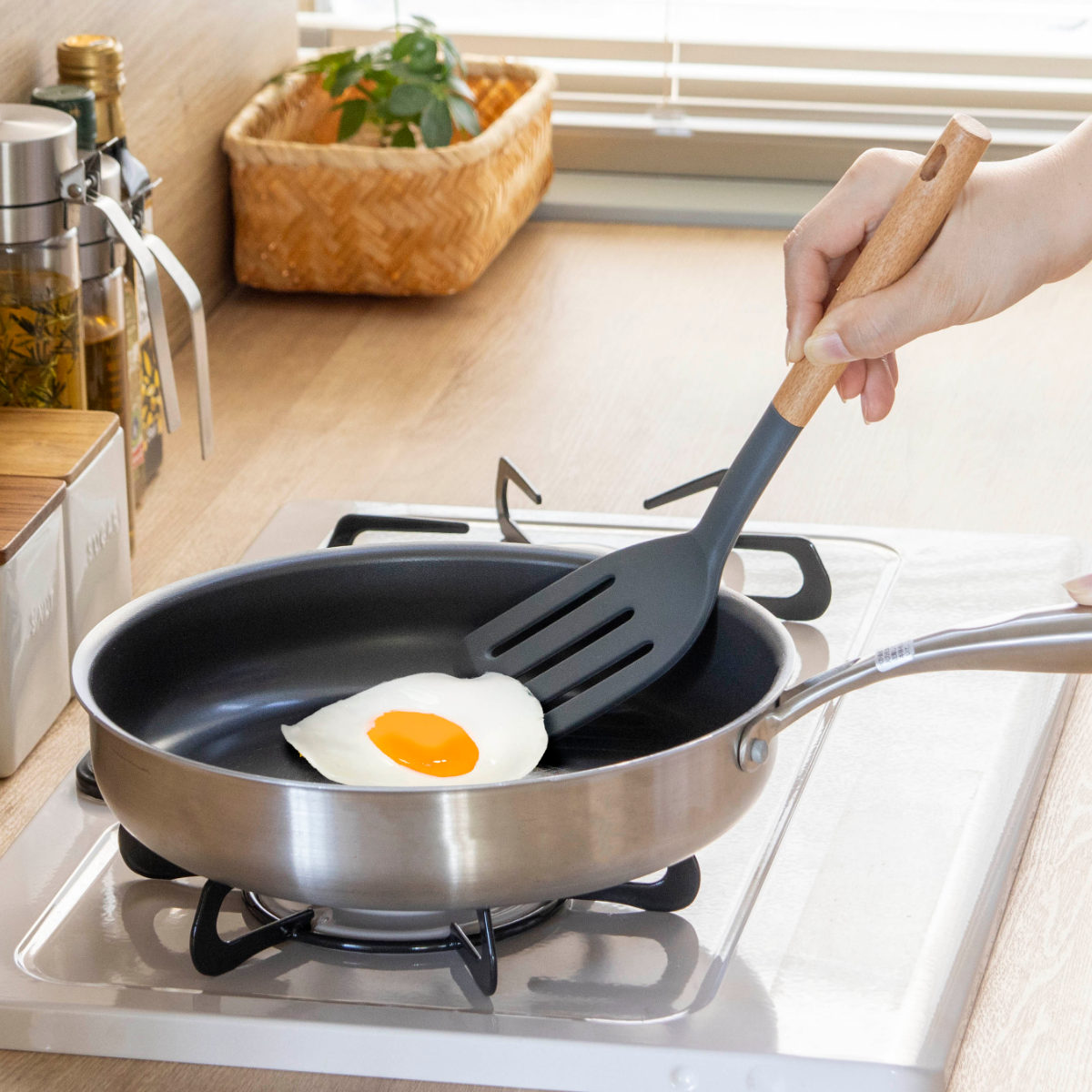 ツールスタンドに立てておくと、片手でサッと取れて調理がスムーズです。ナチュラルテイストなので、キッチンでも悪目立ちせずによく馴染みます。