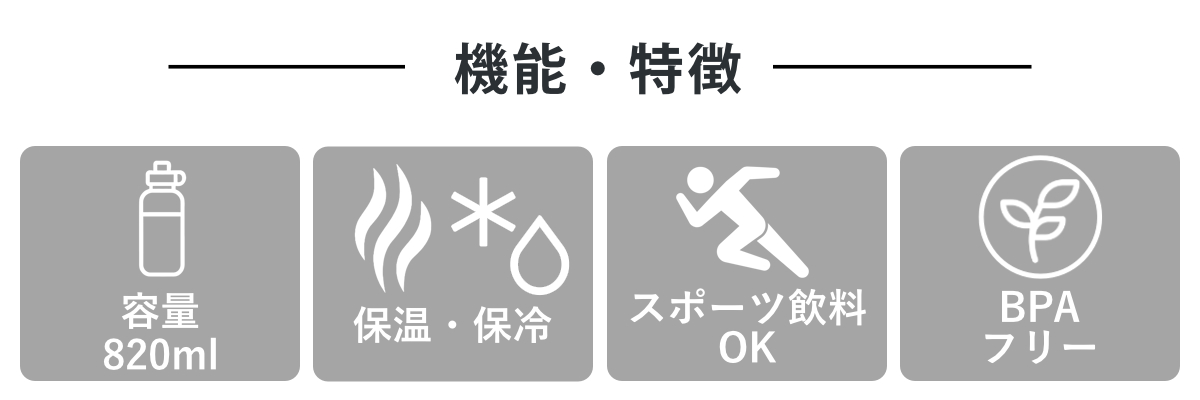 取っ手などの無駄な出っ張りがなく、カバンやランドセルに入れやすいのも特徴です。サイズは2サイズ展開で、夏季の通勤や通学におすすめの820mlと、レジャーや部活動などのスポーツシーンでも活躍する1.03Lです。